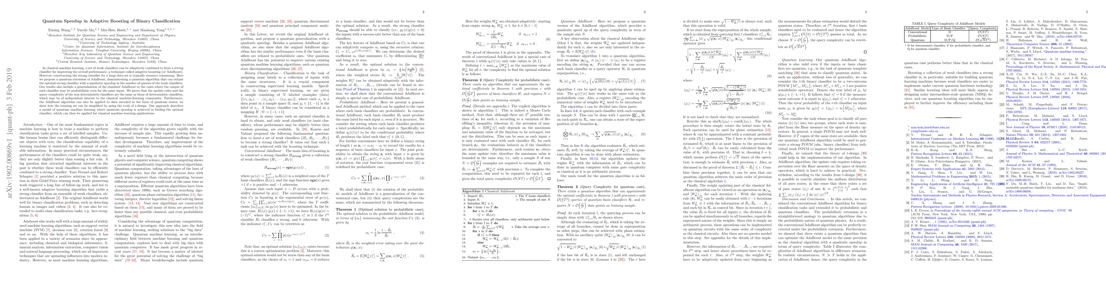 Researchers propose a quantum algorithm for adaptive boosting of binary classification that achieves a quadratic speedup in queries compared to classical methods, enabling faster training times and improved performance.