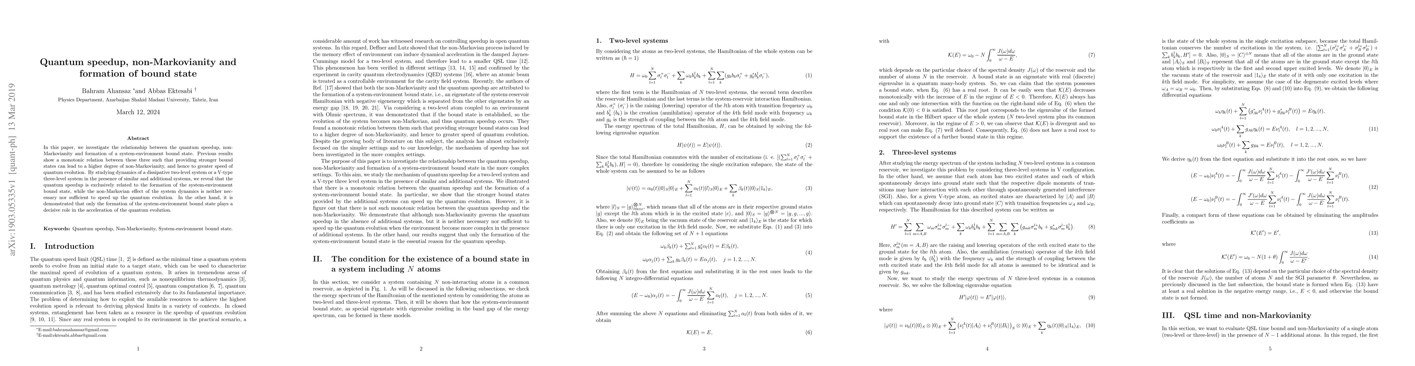 In this paper, we investigate the relationship between the quantum speedup, nonMarkovianity and formation of a system-environment bound state. Previous results show a monotonic relation between these three such that providing stronger bound states can lead to a higher degree of non-Markovianity, and hence to greater speed of quantum evolution. By studying dynamics of a dissipative two-level system or a V-type three-level system in the presence of similar and additional systems, we reveal that the quantum speedup is exclusively related to the formation of the system-environment bound state, while the non-Markovian effect of the system dynamics is neither necessary nor sufficient to speed up the quantum evolution. In the other hand, it is demonstrated that only the formation of the system-environment bound state plays a decisive role in the acceleration of the quantum evolution.