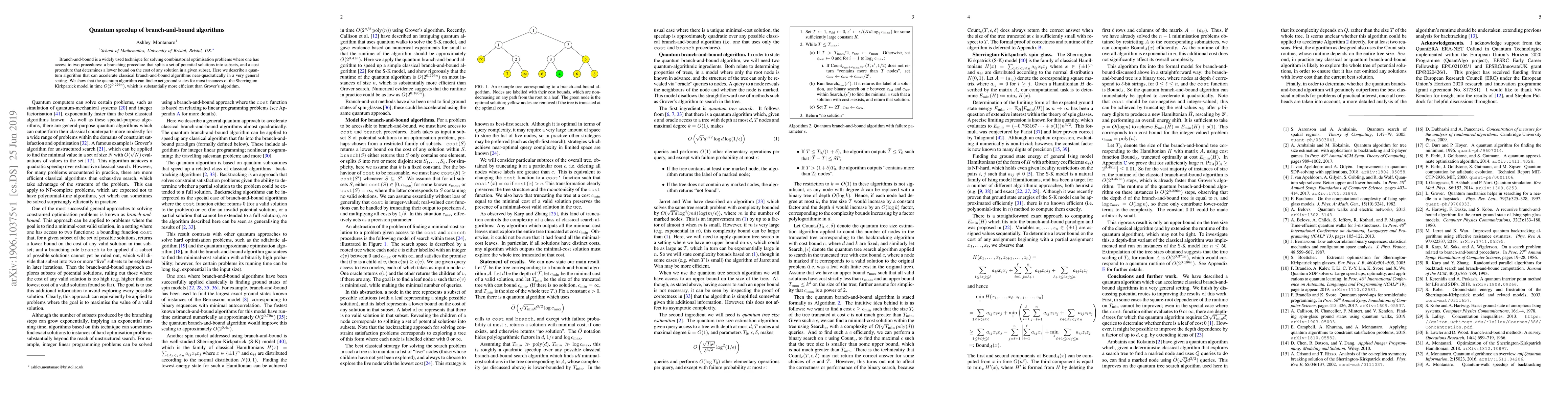 Branch-and-bound is a widely used technique for solving combinatorial optimisation problems where one has access to two procedures: a branching procedure that splits a set of potential solutions into subsets, and a cost procedure that determines a lower bound on the cost of any solution in a given subset. Here we describe a quantum algorithm that can accelerate classical branch-and-bound algorithms near-quadratically in a very general setting. We show that the quantum algorithm can find exact ground states for most instances of the Sherrington-Kirkpatrick model in time $O(2^{0.226n})$, which is substantially more efficient than Grover's algorithm.