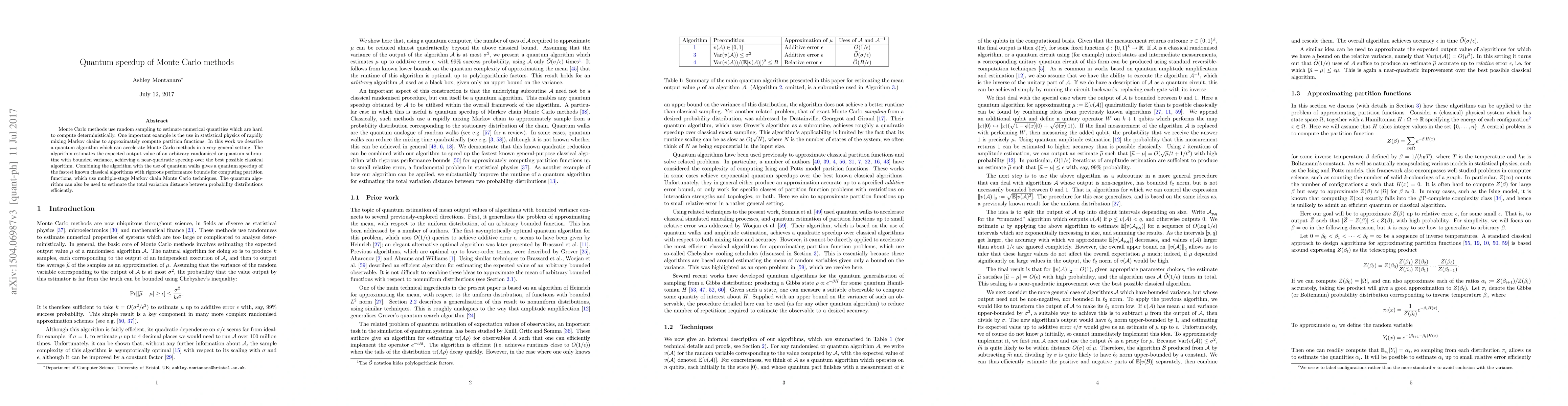 This paper presents a quantum algorithm that accelerates Monte Carlo methods, achieving near-quadratic speedup over classical counterparts. The algorithm efficiently estimates outputs of randomized or quantum subroutines, and when combined with quantum walks, provides a speedup for computing partition functions in statistical physics.