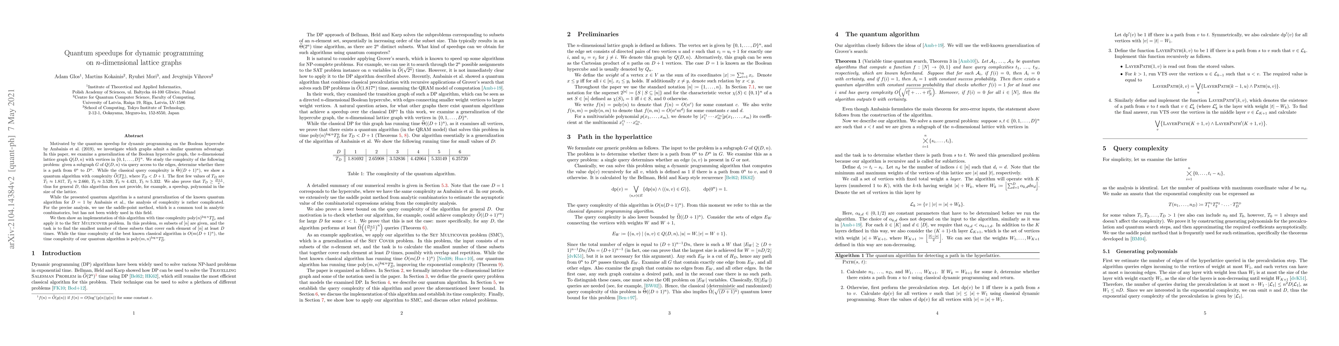 Motivated by the quantum speedup for dynamic programming on the Boolean hypercube by Ambainis et al. (2019), we investigate which graphs admit a similar quantum advantage. In this paper, we examine a generalization of the Boolean hypercube graph, the $n$-dimensional lattice graph $Q(D,n)$ with vertices in $\{0,1,\ldots,D\}^n$. We study the complexity of the following problem: given a subgraph $G$ of $Q(D,n)$ via query access to the edges, determine whether there is a path from $0^n$ to $D^n$. While the classical query complexity is $\widetilde{\Theta}((D+1)^n)$, we show a quantum algorithm with complexity $\widetilde O(T_D^n)$, where $T_D < D+1$. The first few values of $T_D$ are $T_1 \approx 1.817$, $T_2 \approx 2.660$, $T_3 \approx 3.529$, $T_4 \approx 4.421$, $T_5 \approx 5.332$. We also prove that $T_D \geq \frac{D+1}{\mathrm e}$, thus for general $D$, this algorithm does not provide, for example, a speedup, polynomial in the size of the lattice. While the presented quantum algorithm is a natural generalization of the known quantum algorithm for $D=1$ by Ambainis et al., the analysis of complexity is rather complicated. For the precise analysis, we use the saddle-point method, which is a common tool in analytic combinatorics, but has not been widely used in this field. We then show an implementation of this algorithm with time complexity $\text{poly}(n)^{\log n} T_D^n$, and apply it to the Set Multicover problem. In this problem, $m$ subsets of $[n]$ are given, and the task is to find the smallest number of these subsets that cover each element of $[n]$ at least $D$ times. While the time complexity of the best known classical algorithm is $O(m(D+1)^n)$, the time complexity of our quantum algorithm is $\text{poly}(m,n)^{\log n} T_D^n$.
