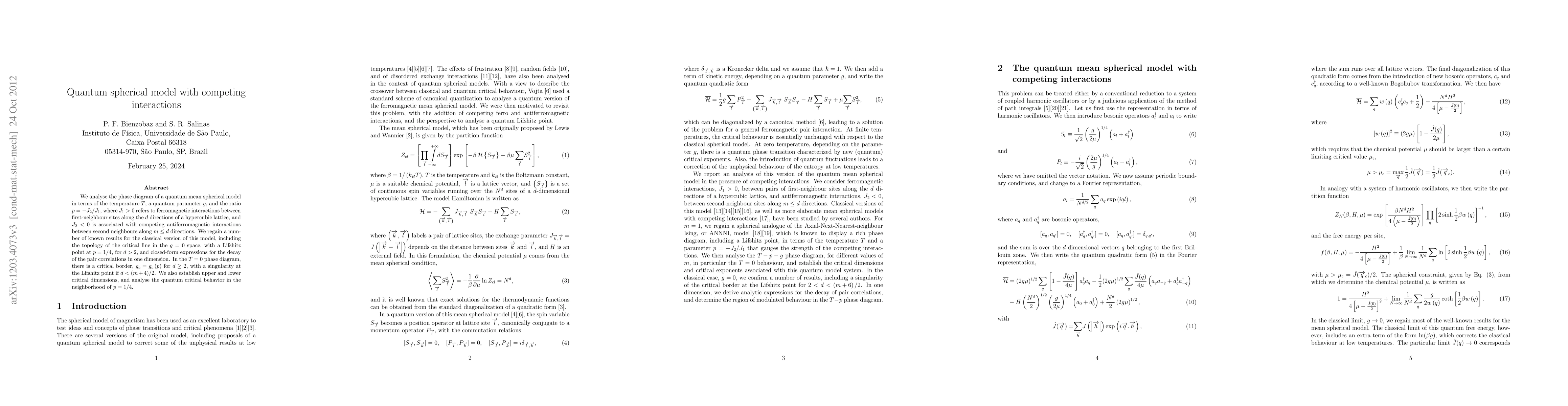 This research paper analyzes a quantum model with competing interactions, regaining known results for classical models in certain conditions and establishing new critical dimensions and behavior at the Lifshitz point.