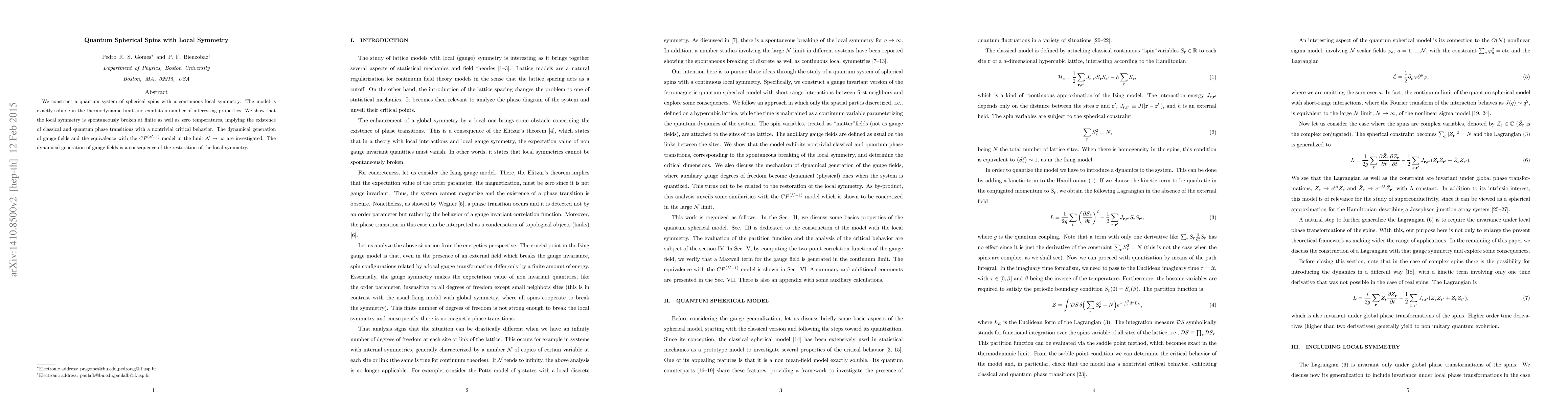 We construct a quantum system of spherical spins with a continuous local symmetry. The model is exactly soluble in the thermodynamic limit and exhibits a number of interesting properties. We show that the local symmetry is spontaneously broken at finite as well as zero temperatures, implying the existence of classical and quantum phase transitions with a nontrivial critical behavior. The dynamical generation of gauge fields and the equivalence with the $CP^{(\mathcal{N}-1)}$ model in the limit $\mathcal{N}\rightarrow\infty$ are investigated. The dynamical generation of gauge fields is a consequence of the restoration of the local symmetry.