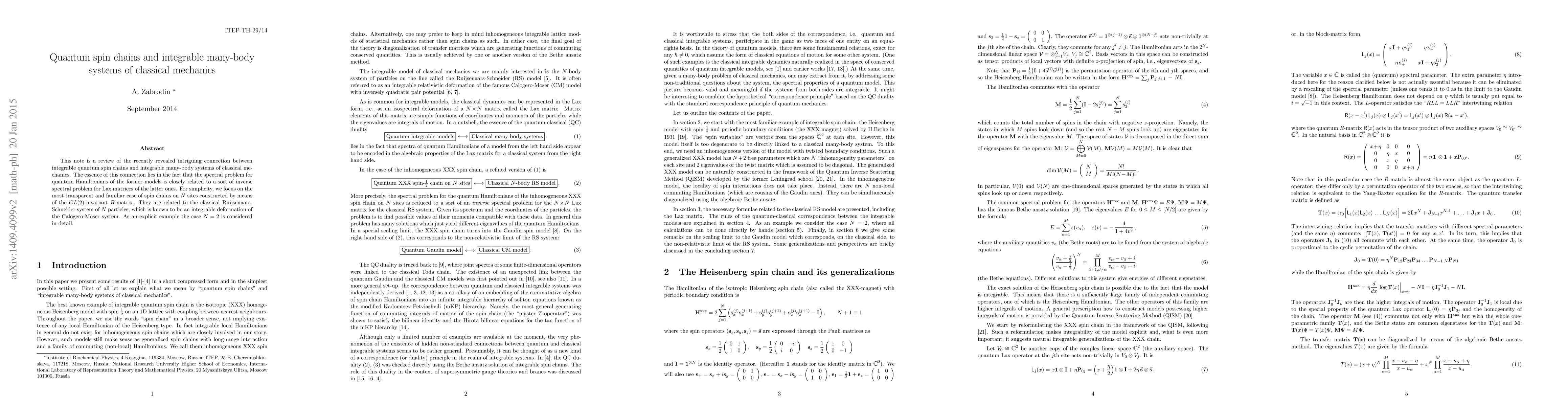 This note is a review of the recently revealed intriguing connection between integrable quantum spin chains and integrable many-body systems of classical mechanics. The essence of this connection lies in the fact that the spectral problem for quantum Hamiltonians of the former models is closely related to a sort of inverse spectral problem for Lax matrices of the latter ones. For simplicity, we focus on the most transparent and familiar case of spin chains on N sites constructed by means of the GL(2)-invariant R-matrix. They are related to the classical Ruijsenaars-Schneider system of N particles, which is known to be an integrable deformation of the Calogero-Moser system. As an explicit example the case N=2 is considered in detail.