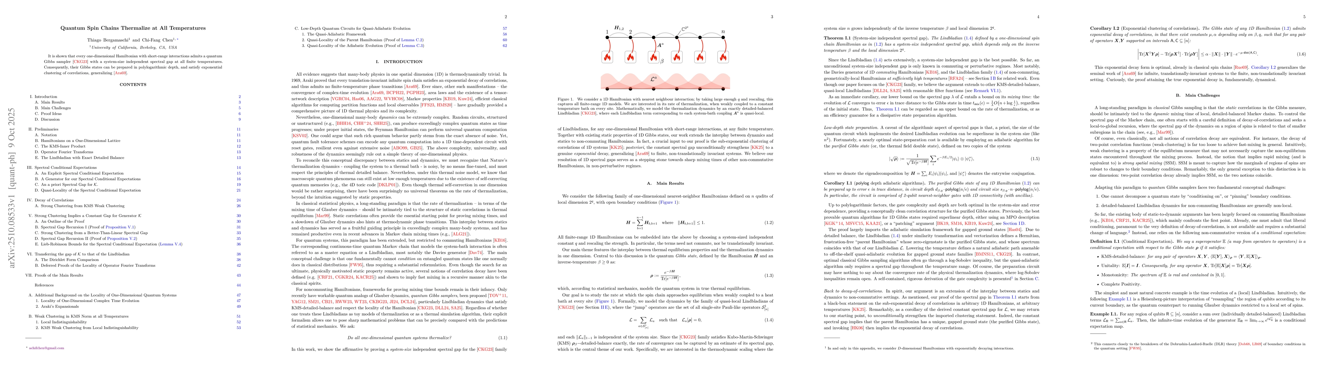 It is shown that every one-dimensional Hamiltonian with short-range interaction admits a quantum Gibbs sampler [CKG23] with a system-size independent spectral gap at all finite temperatures. Consequently, their Gibbs states can be prepared in polylogarithmic depth, and satisfy exponential clustering of correlations, generalizing [Ara69].