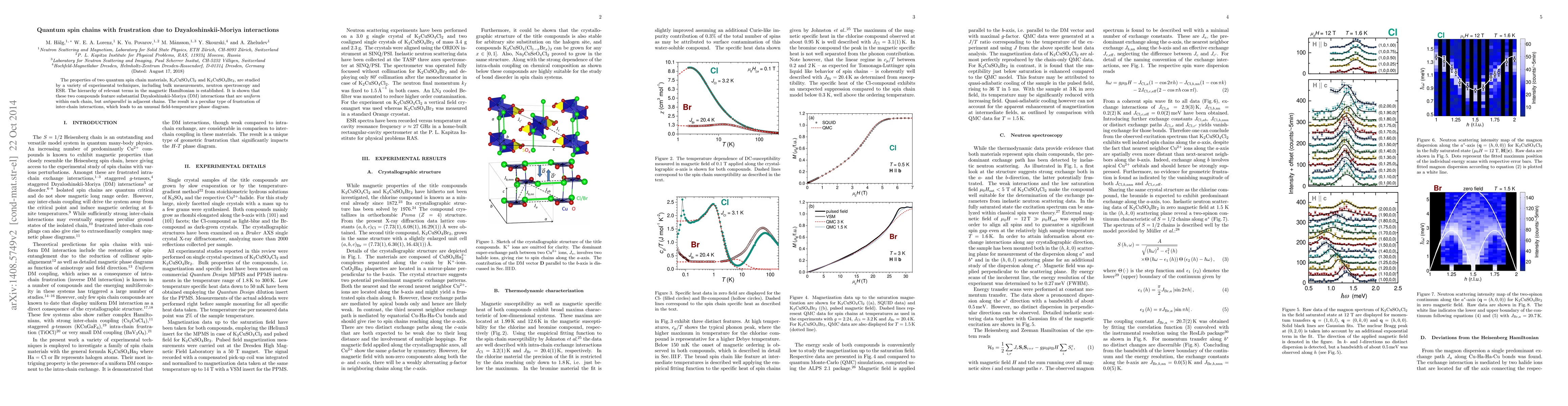 This paper investigates the magnetic properties of K$_2$CuSO$_4$Cl$_2$ and K$_2$CuSO$_4$Br$_2$ quantum spin chains, revealing substantial Dzyaloshinskii-Moriya interactions causing frustration between adjacent chains, resulting in an unusual field-temperature phase diagram. Experimental techniques include bulk measurements, neutron spectroscopy, and ESR.