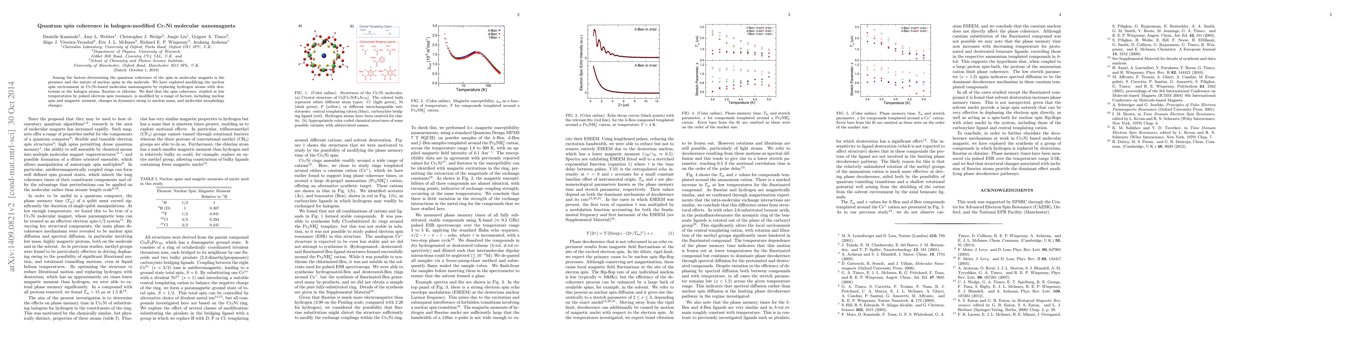 Among the factors determining the quantum coherence of the spin in molecular magnets is the presence and the nature of nuclear spins in the molecule. We have explored modifying the nuclear spin environment in Cr$_7$Ni-based molecular nanomagnets by replacing hydrogen atoms with deuterium or the halogen atoms, fluorine or chlorine. We find that the spin coherence, studied at low temperatures by pulsed electron spin resonance, is modified by a range of factors, including nuclear spin and magnetic moment, changes in dynamics owing to nuclear mass, and molecular morphology changes.