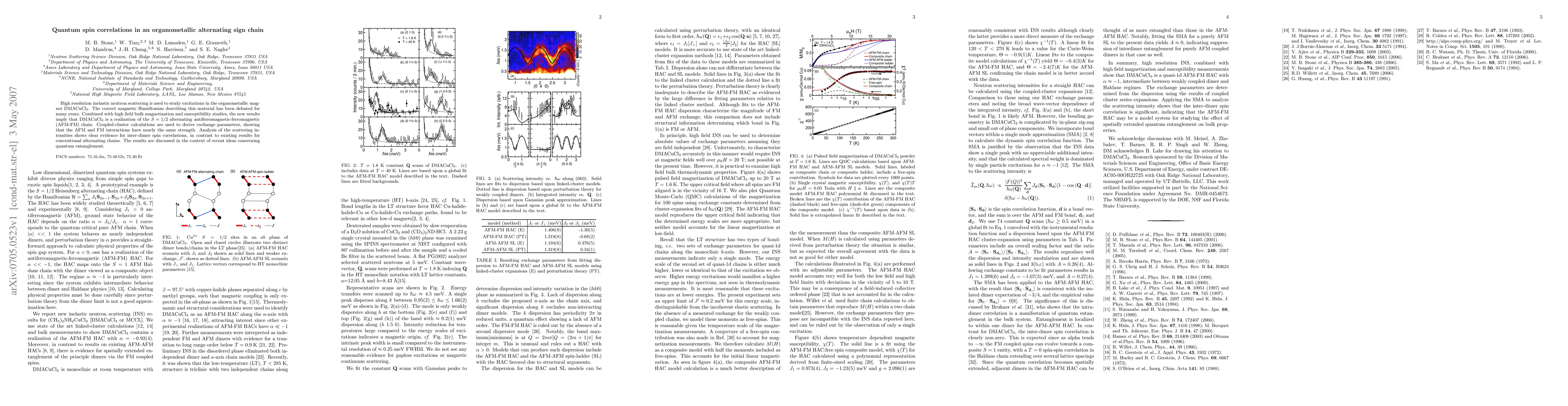 High resolution inelastic neutron scattering is used to study excitations in the organometallic magnet DMACuCl$_3$. The correct magnetic Hamiltonian describing this material has been debated for many years. Combined with high field bulk magnetization and susceptibility studies, the new results imply that DMACuCl$_3$ is a realization of the $S=1/2$ alternating antiferromagnetic-ferromagnetic (AFM-FM) chain. Coupled-cluster calculations are used to derive exchange parameters, showing that the AFM and FM interactions have nearly the same strength. Analysis of the scattering intensities shows clear evidence for inter-dimer spin correlations, in contrast to existing results for conventional alternating chains. The results are discussed in the context of recent ideas concerning quantum entanglement.