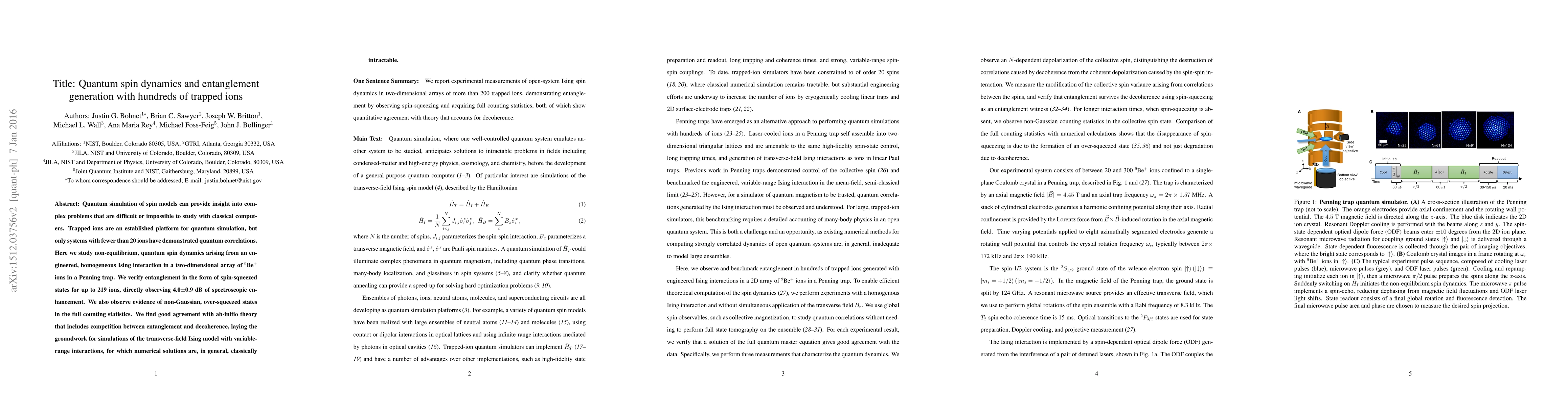 This paper investigates quantum spin dynamics and entanglement generation in a two-dimensional array of 219 trapped beryllium ions, demonstrating spin-squeezed states and non-Gaussian statistics, and laying the foundation for quantum simulations of complex spin models. The study shows strong agreement between experimental results and theoretical predictions, highlighting the potential of trapped ions for tackling classically intractable problems.