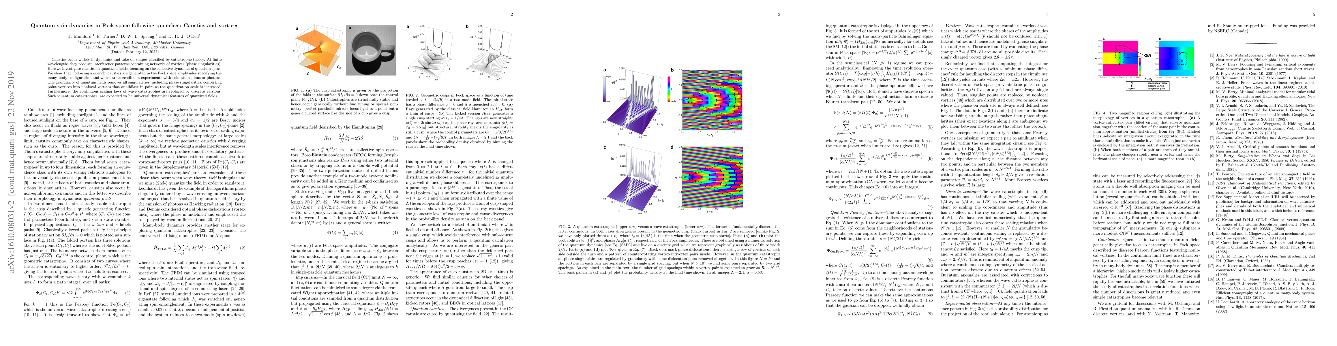 This research explores quantum spin dynamics in Fock space after quenches, revealing caustics and vortices. Unlike classical caustics, quantum versions lack singularities, replacing point vortices with nonlocal ones that pairwise annihilate as quantization scale increases. These 'quantum catastrophes' are expected to be universal in quantized fields.