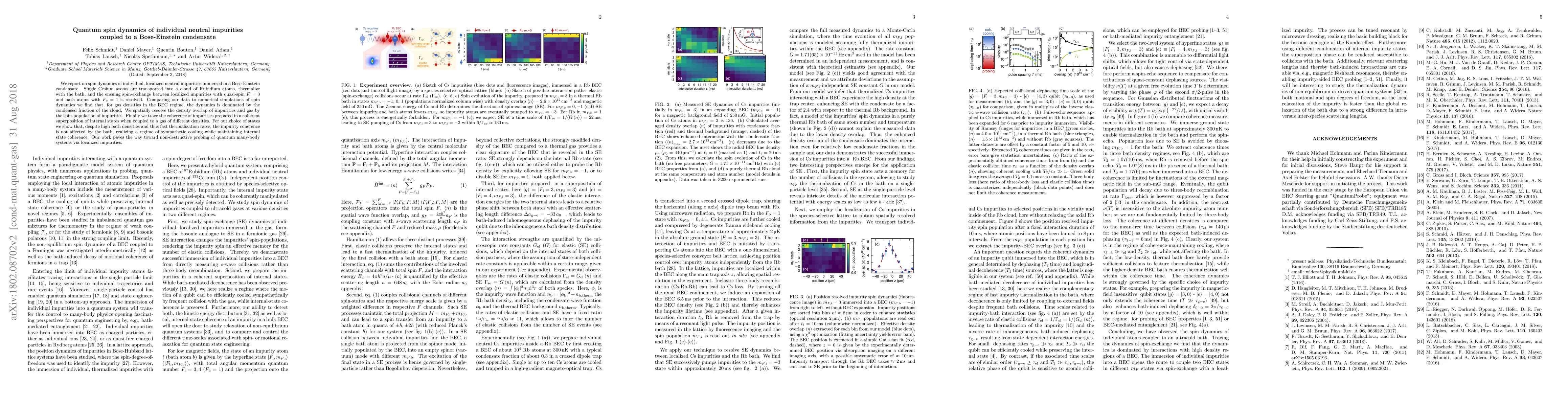 We report on spin dynamics of individual, localized neutral impurities immersed in a Bose-Einstein condensate. Single Cesium atoms are transported into a cloud of Rubidium atoms, thermalize with the bath, and the ensuing spin-exchange between localized impurities with quasi-spin $F_i=3$ and bath atoms with $F_b=1$ is resolved. Comparing our data to numerical simulations of spin dynamics we find that, for gas densities in the BEC regime, the dynamics is dominated by the condensed fraction of the cloud. We spatially resolve the density overlap of impurities and gas by the spin-population of impurities. Finally we trace the coherence of impurities prepared in a coherent superposition of internal states when coupled to a gas of different densities. For our choice of states we show that, despite high bath densities and thus fast thermalization rates, the impurity coherence is not affected by the bath, realizing a regime of sympathetic cooling while maintaining internal state coherence. Our work paves the way toward non-destructive probing of quantum many-body systems via localized impurities.