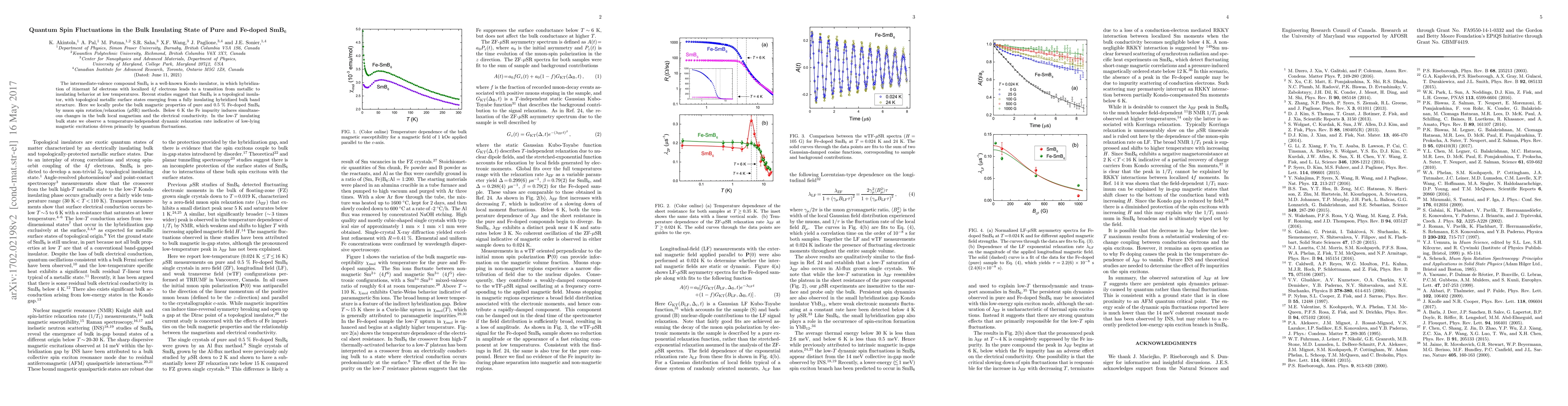 The intermediate-valence compound SmB6 is a well-known Kondo insulator, in which hybridization of itinerant 5d electrons with localized 4f electrons leads to a transition from metallic to insulating behavior at low temperatures. Recent studies suggest that SmB6 is a topological insulator, with topological metallic surface states emerging from a fully insulating hybridized bulk band structure. Here we locally probe the bulk magnetic properties of pure and 0.5 % Fe-doped SmB6 by muon spin rotation/relaxation methods. Below 6 K the Fe impurity induces simultaneous changes in the bulk local magnetism and the electrical conductivity. In the low-temperature insulating bulk state we observe a temperature-independent dynamic relaxation rate indicative of low-lying magnetic excitations driven primarily by quantum fluctuations.