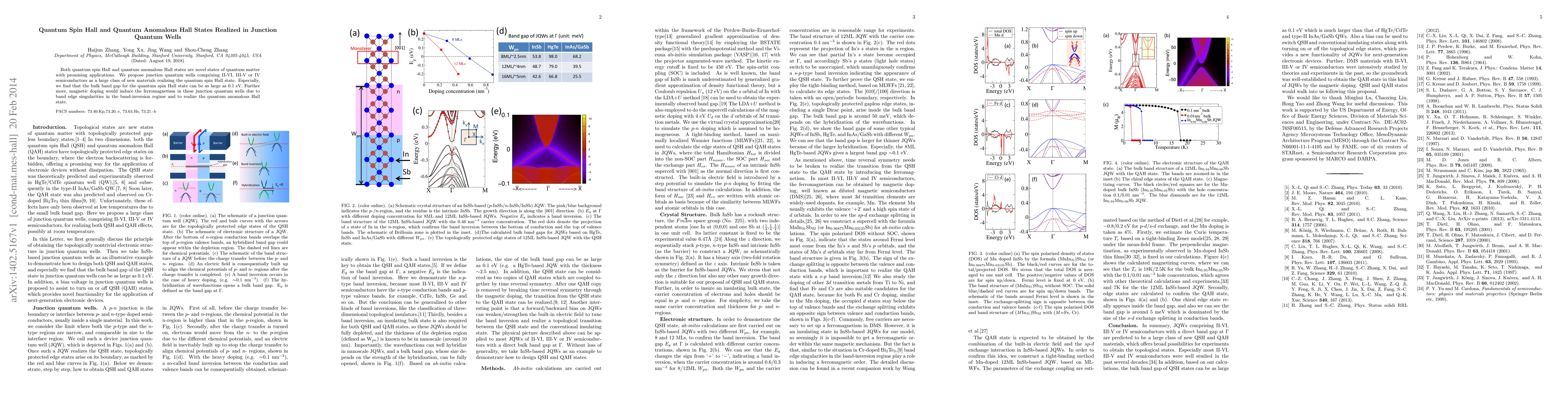 This paper proposes junction quantum wells in II-VI, III-V, or IV semiconductors as materials for realizing quantum spin Hall states, with a large band gap of 0.1 eV. It also discusses how magnetic doping can induce ferromagnetism to achieve quantum anomalous Hall states.
