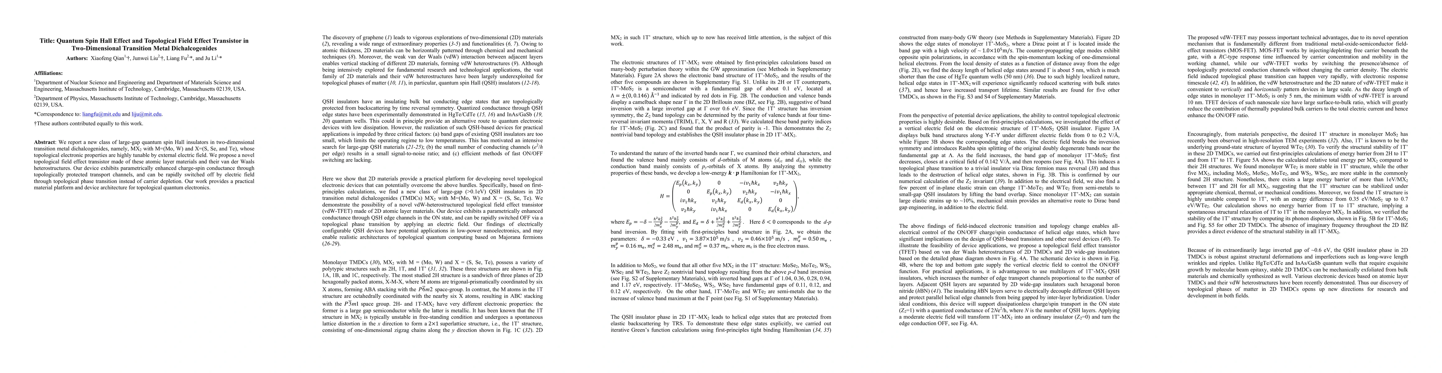 This paper introduces a class of tunable quantum spin Hall insulators in two-dimensional transition metal dichalcogenides, MX$_2$ (M=Mo, W; X=S, Se, Te). The authors propose a topological field effect transistor using these materials, demonstrating enhanced charge-spin conductance and rapid switching off via topological phase transition.