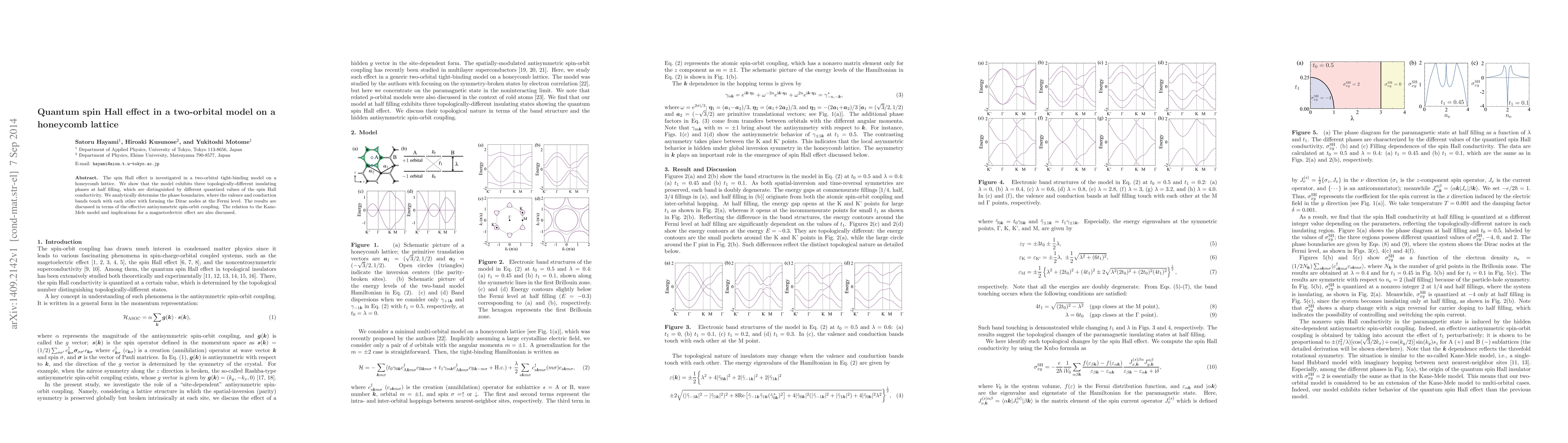 This paper investigates the quantum spin Hall effect in a two-orbital model on a honeycomb lattice, revealing three topologically distinct insulating phases with quantized spin Hall conductivities. The study analytically determines the phase boundaries and discusses the implications of effective antisymmetric spin-orbit coupling, including connections to the Kane-Mele model and potential magnetoelectric effects.