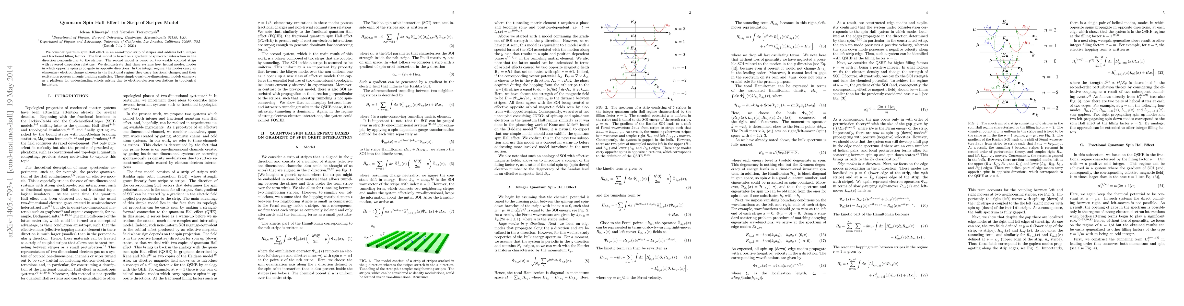 The paper presents detailed theoretical models and Hamiltonians for systems exhibiting Quantum Spin Hall Effect, including an anisotropic strip of stripes and a bilayer system, and analyzes their edge modes and topological properties.