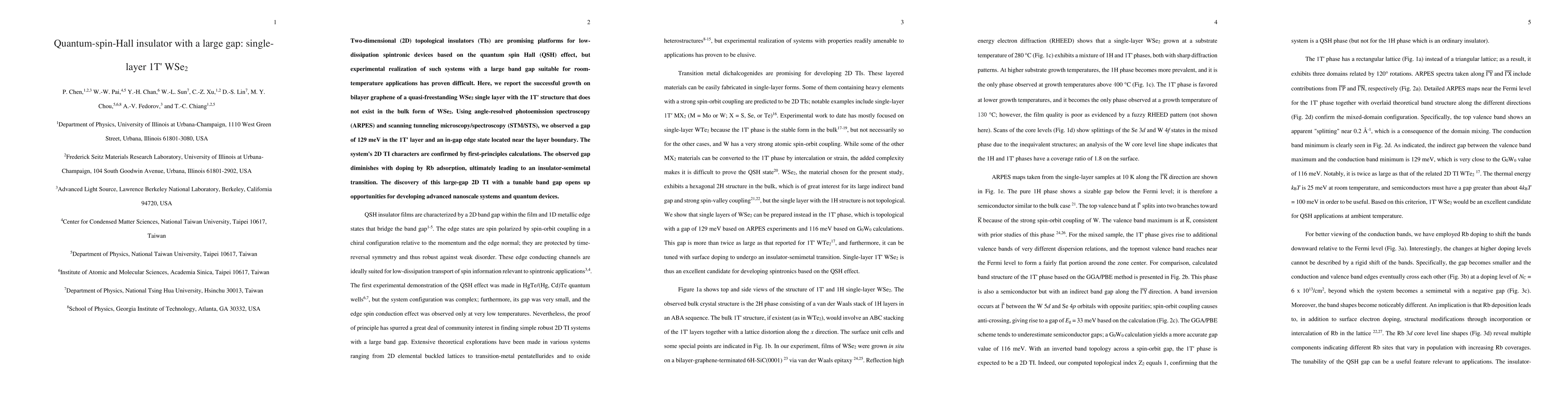 Researchers have successfully grown a single layer of 1T' WSe2 on bilayer graphene, exhibiting a large quantum spin Hall insulator gap of 129 meV, observable via ARPES and STM/STS. This 2D topological insulator's properties are confirmed by calculations, and its gap can be tuned with Rb doping, opening avenues for advanced nanoscale devices.