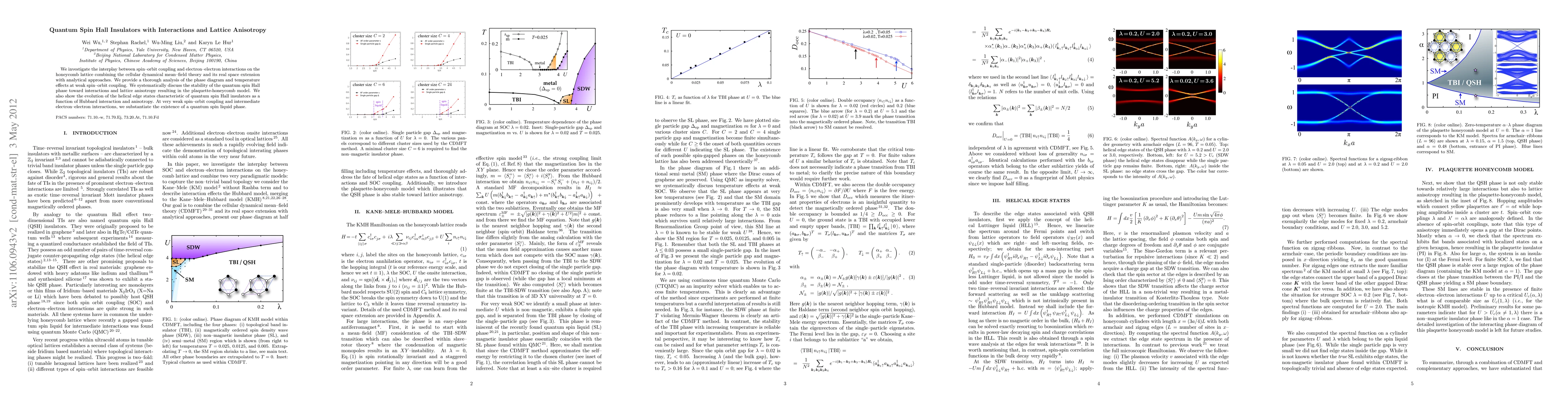 We investigate the interplay between spin-orbit coupling and electron-electron interactions on the honeycomb lattice combining the cellular dynamical mean-field theory and its real space extension with analytical approaches. We provide a thorough analysis of the phase diagram and temperature effects at weak spin-orbit coupling. We systematically discuss the stability of the quantum spin Hall phase toward interactions and lattice anisotropy resulting in the plaquette-honeycomb model. We also show the evolution of the helical edge states characteristic of quantum spin Hall insulators as a function of Hubbard interaction and anisotropy. At very weak spin-orbit coupling and intermediate electron-electron interactions, we substantiate the existence of a quantum spin liquid phase.