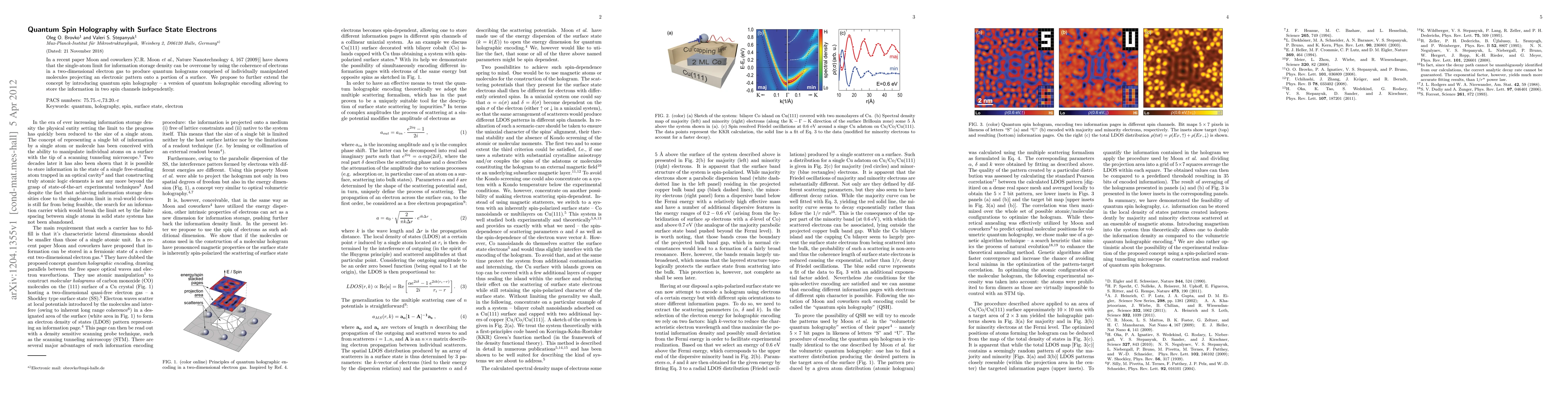 In a recent paper Moon and coworkers [C.R. Moon et al., Nature Nanotechnology 4, 167 (2009)] have shown that the single-atom limit for information storage density can be overcome by using the coherence of electrons in a two-dimensional electron gas to produce quantum holograms comprised of individually manipulated molecules projecting an electronic pattern onto a portion of a surface. We propose to further extend the concept by introducing quantum spin holography - a version of quantum holographic encoding allowing to store the information in two spin channels independently.