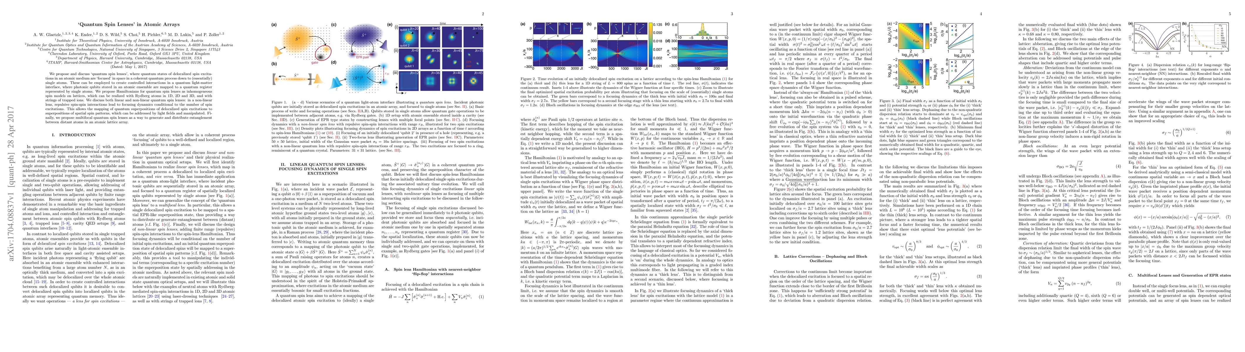 We propose and discuss `quantum spin lenses', where quantum states of delocalized spin excitations in an atomic medium are `focused' in space in a coherent quantum process down to (essentially) single atoms. These can be employed to create controlled interactions in a quantum light-matter interface, where photonic qubits stored in an atomic ensemble are mapped to a quantum register represented by single atoms. We propose Hamiltonians for quantum spin lenses as inhomogeneous spin models on lattices, which can be realized with Rydberg atoms in 1D, 2D and 3D, and with strings of trapped ions. We discuss both linear and non-linear quantum spin lenses: in a non-linear lens, repulsive spin-spin interactions lead to focusing dynamics conditional to the number of spin excitations. This allows the mapping of quantum superpositions of delocalized spin excitations to superpositions of spatial spin patterns, which can be addressed by light fields and manipulated. Finally, we propose multifocal quantum spin lenses as a way to generate and distribute entanglement between distant atoms in an atomic lattice array.