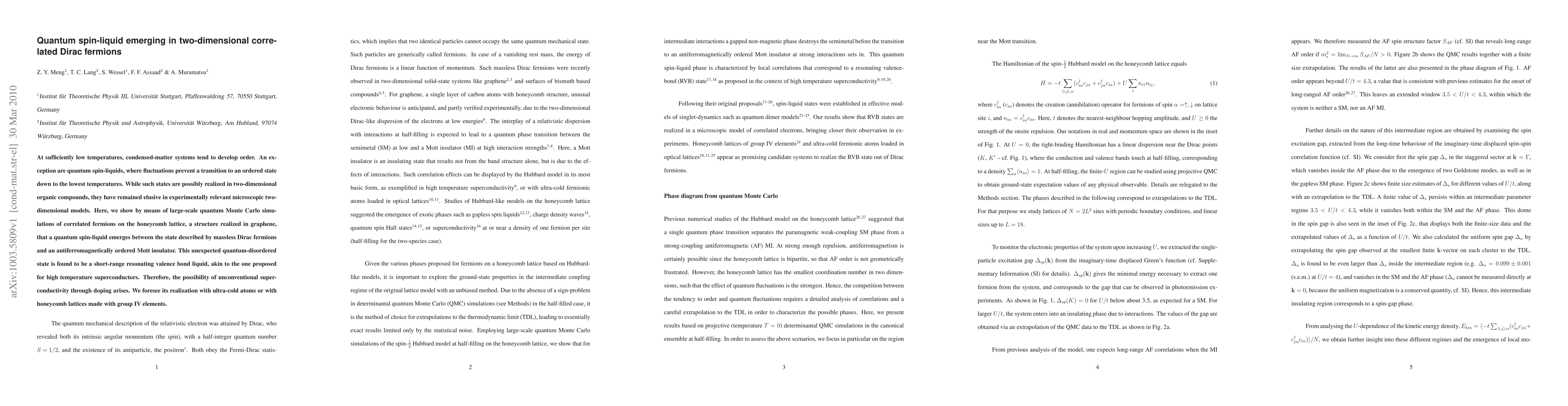 The research demonstrates the emergence of a quantum spin-liquid state in two-dimensional correlated Dirac fermions on a honeycomb lattice using quantum Monte Carlo simulations. This disordered state, akin to resonating valence bonds, suggests potential for unconventional superconductivity and is anticipated in systems like graphene or honeycomb lattices made with group IV elements.