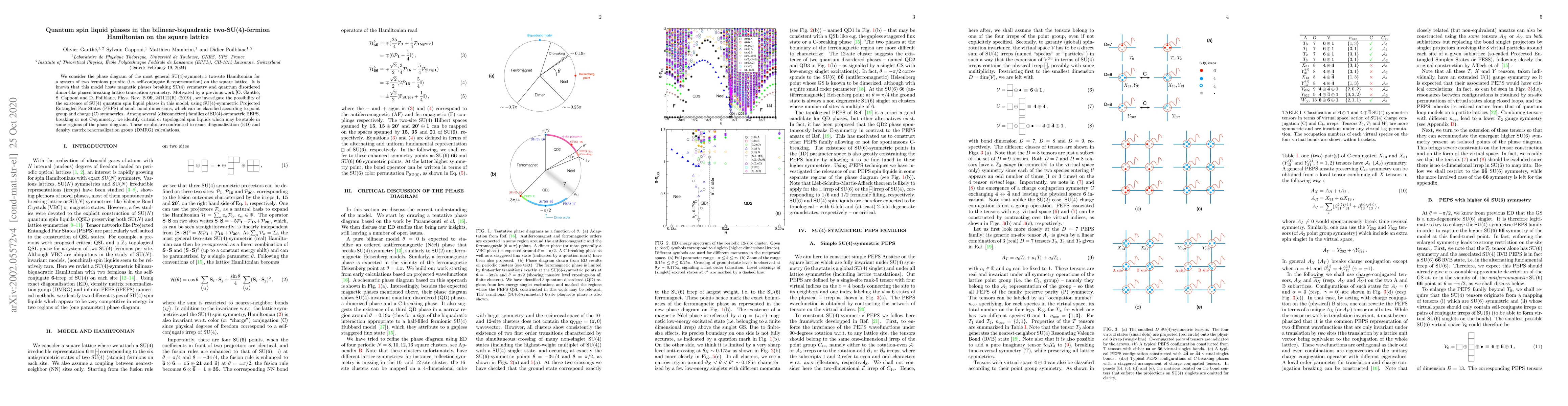 We consider the phase diagram of the most general SU(4)-symmetric two-site Hamiltonian for a system of two fermions per site (ie self-conjugate $\bf 6$ representation) on the square lattice. It is known that this model hosts magnetic phases breaking SU(4) symmetry and quantum disordered dimer-like phases breaking lattice translation symmetry. Motivated by a previous work [O. Gauth\'e, S. Capponi and D. Poilblanc, Phys. Rev. B $\textbf{99}$, 241112(R) (2019)], we investigate the possibility of the existence of SU(4) quantum spin liquid phases in this model, using SU(4)-symmetric Projected Entangled Pair States (PEPS) of small bond dimensions, which can be classified according to point group and charge (C) symmetries. Among several (disconnected) families of SU(4)-symmetric PEPS, breaking or not C-symmetry, we identify critical or topological spin liquids which may be stable in some regions of the phase diagram. These results are confronted to exact diagonalisation (ED) and density matrix renormalisation group (DMRG) calculations.