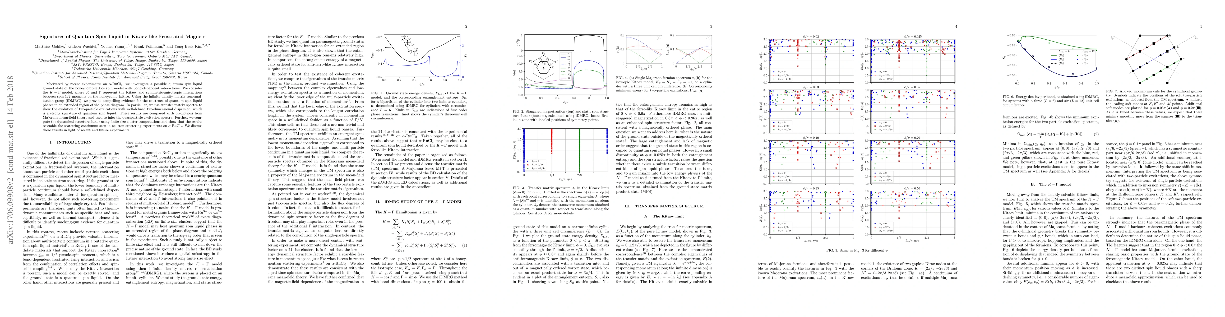 Motivated by recent experiments on $\alpha$-RuCl$_3$, we investigate a possible quantum spin liquid ground state of the honeycomb-lattice spin model with bond-dependent interactions. We consider the $K-\Gamma$ model, where $K$ and $\Gamma$ represent the Kitaev and symmetric-anisotropic interactions between spin-1/2 moments on the honeycomb lattice. Using the infinite density matrix renormalization group (iDMRG), we provide compelling evidence for the existence of quantum spin liquid phases in an extended region of the phase diagram. In particular, we use transfer matrix spectra to show the evolution of two-particle excitations with well-defined two-dimensional dispersion, which is a strong signature of quantum spin liquid. These results are compared with predictions from Majorana mean-field theory and used to infer the quasiparticle excitation spectra. Further, we compute the dynamical structure factor using finite size cluster computations and show that the results resemble the scattering continuum seen in neutron scattering experiments on $\alpha$-RuCl$_3$. We discuss these results in light of recent and future experiments.