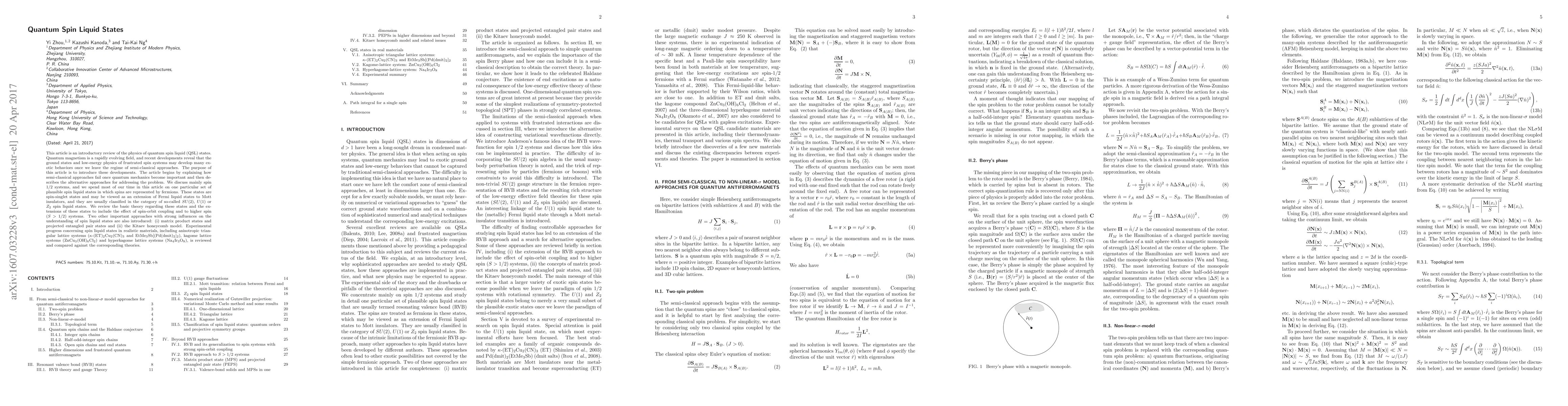 This article is an introductory review of the physics of quantum spin liquid (QSL) states. Quantum magnetism is a rapidly evolving field, and recent developments reveal that the ground states and low-energy physics of frustrated spin systems may develop many exotic behaviors once we leave the regime of semi-classical approaches. The purpose of this article is to introduce these developments. The article begins by explaining how semi-classical approaches fail once quantum mechanics become important and then describes the alternative approaches for addressing the problem. We discuss mainly spin $1/2$ systems, and we spend most of our time in this article on one particular set of plausible spin liquid states in which spins are represented by fermions. These states are spin-singlet states and may be viewed as an extension of Fermi liquid states to Mott insulators, and they are usually classified in the category of so-called $SU(2)$, $U(1)$ or $Z_2$ spin liquid states. We review the basic theory regarding these states and the extensions of these states to include the effect of spin-orbit coupling and to higher spin ($S>1/2$) systems. Two other important approaches with strong influences on the understanding of spin liquid states are also introduced: (i) matrix product states and projected entangled pair states and (ii) the Kitaev honeycomb model. Experimental progress concerning spin liquid states in realistic materials, including anisotropic triangular lattice systems ($\kappa$-(ET)$_{2}$Cu$_{2}$(CN)$_{3}$ and EtMe$_{3}$Sb[(Pd(dmit)$_{2}$]$_{2}$), kagome lattice systems (ZnCu$_{3}$(OH)$_{6}$Cl$_{2}$) and hyperkagome lattice systems (Na$_{4}$Ir$_{3}$O$_{8}$), is reviewed and compared against the corresponding theories.