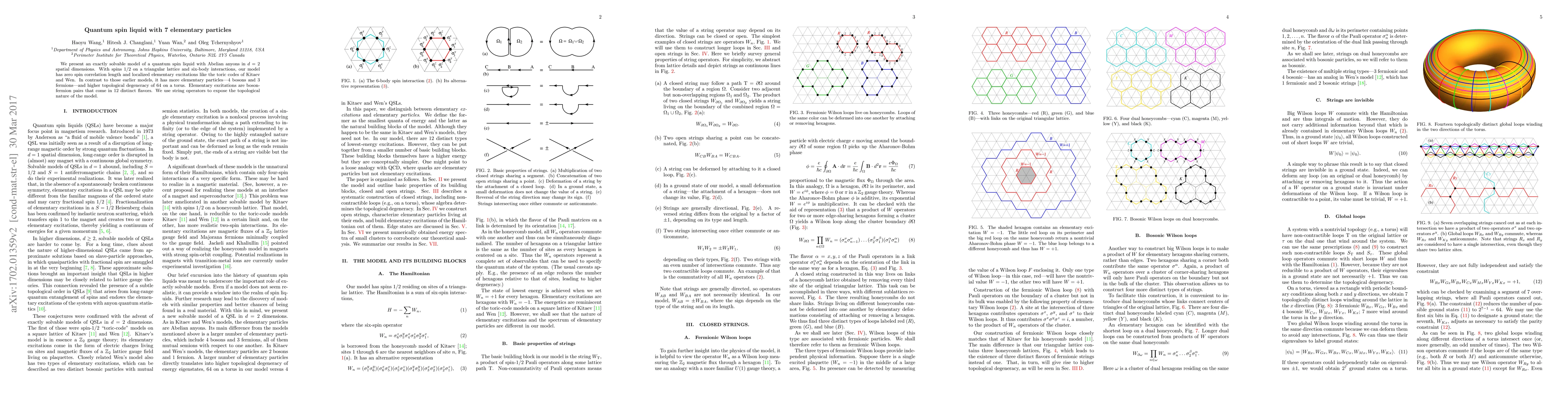 We present an exactly solvable model of a quantum spin liquid with Abelian anyons in d=2 spatial dimensions. With spins 1/2 on a triangular lattice and six-body interactions, our model has zero spin correlation length and localized elementary excitations like the toric codes of Kitaev and Wen. In contrast to those earlier models, it has more elementary particles---4 bosons and 3 fermions---and higher topological degeneracy of 64 on a torus. Elementary excitations are boson-fermion pairs that come in 12 distinct flavors. We use string operators to expose the topological nature of the model.