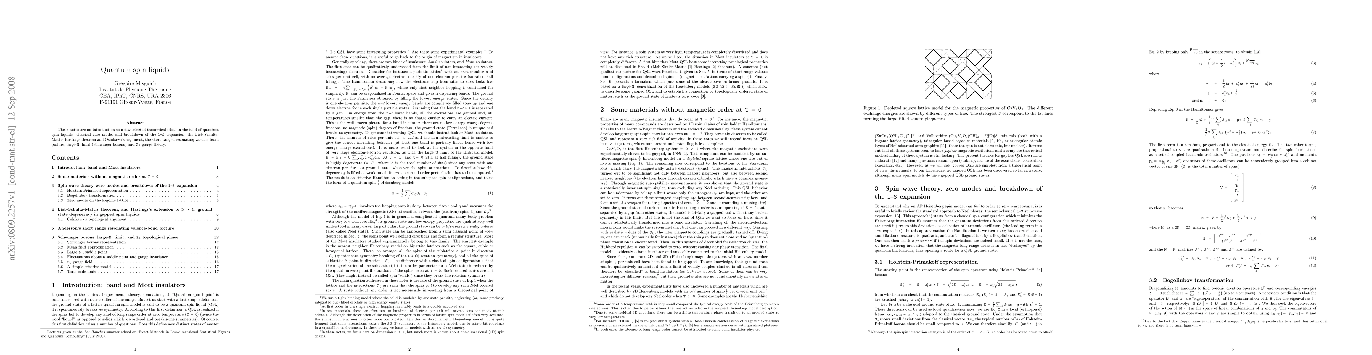 These notes are an introduction to a few selected theoretical ideas in the field of quantum spin liquids: classical zero modes and breakdown of the 1/S expansion, the Lieb-Schultz-Mattis-Hastings theorem and Oshikawa's argument, the short-ranged resonating valence-bond picture, large-N limit (Schwinger bosons) and Z_2 gauge theory.