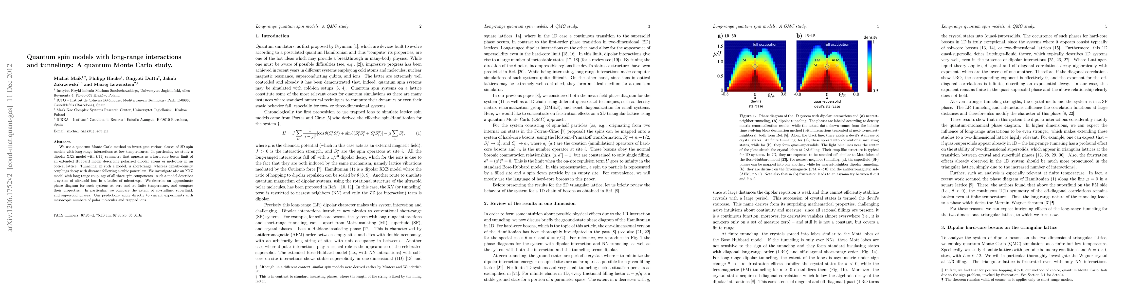 This paper employs quantum Monte Carlo methods to explore 2D spin models with long-range interactions, focusing on dipolar XXZ models. It investigates the phase diagrams of systems with short-range tunneling and long-range cubic power-law density-density couplings, comparing crystalline, superfluid, and supersolid phases in both hard-core boson and ion lattice contexts.