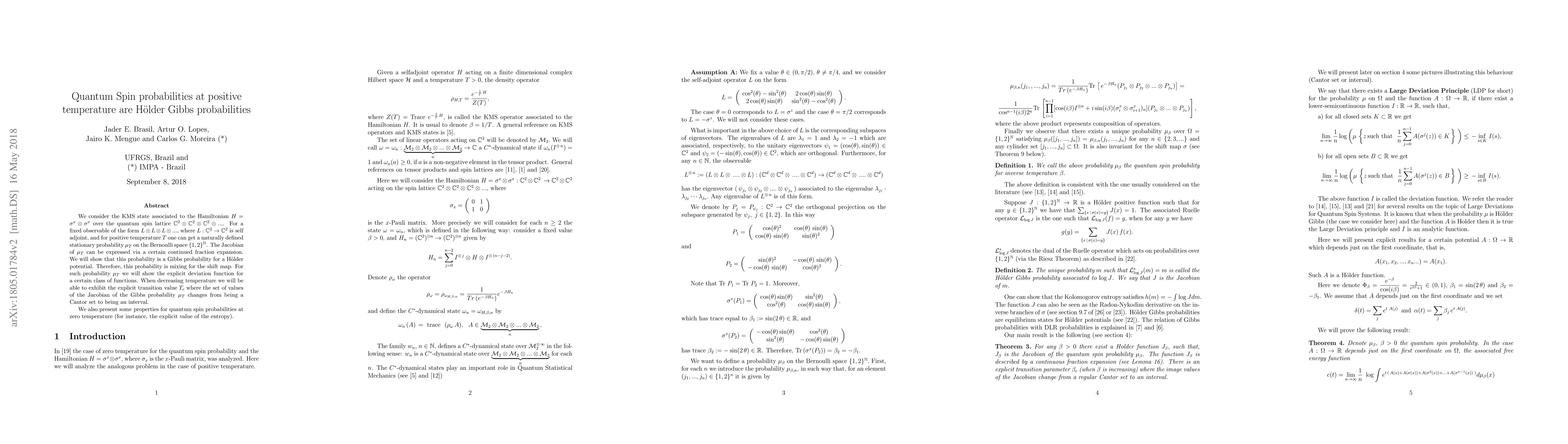 This paper investigates the KMS state associated with a quantum spin Hamiltonian on a lattice, demonstrating that the resulting probability at positive temperature is a H\"older Gibbs probability. It also explores the transition behavior of the Jacobian of this probability as temperature decreases, revealing the transition value where the Jacobian changes from a Cantor set to an interval.