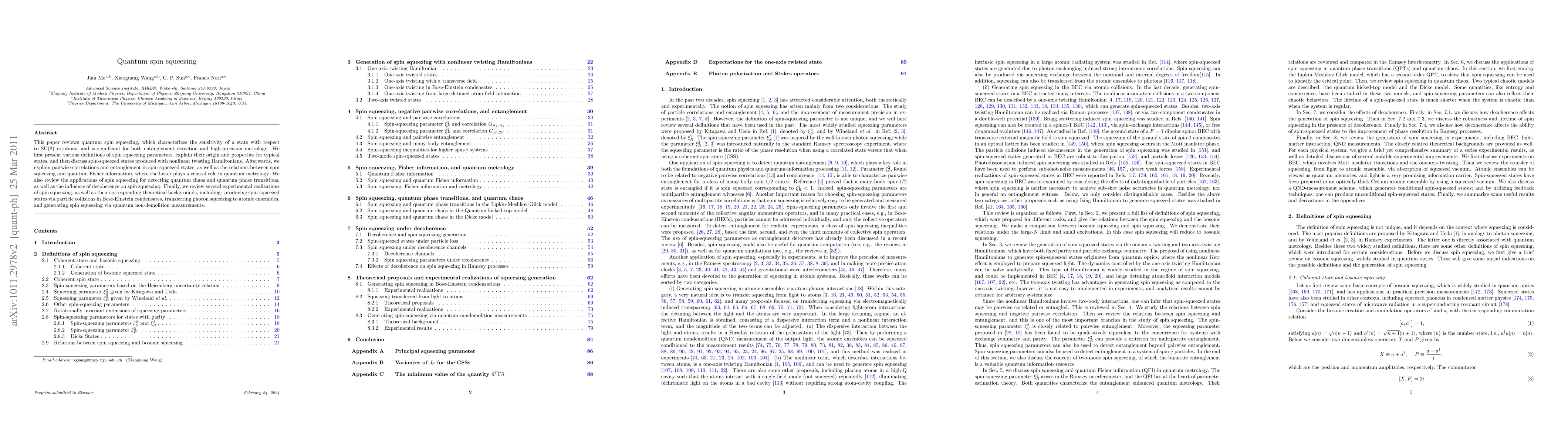 This paper reviews quantum spin squeezing, focusing on its role in entanglement detection and high-precision metrology. It discusses various definitions, origins, and properties of spin-squeezed states, and explores their applications in quantum chaos and phase transitions, alongside the impact of decoherence. Experiments involving spin squeezing in Bose-Einstein condensates and atomic ensembles are also reviewed.