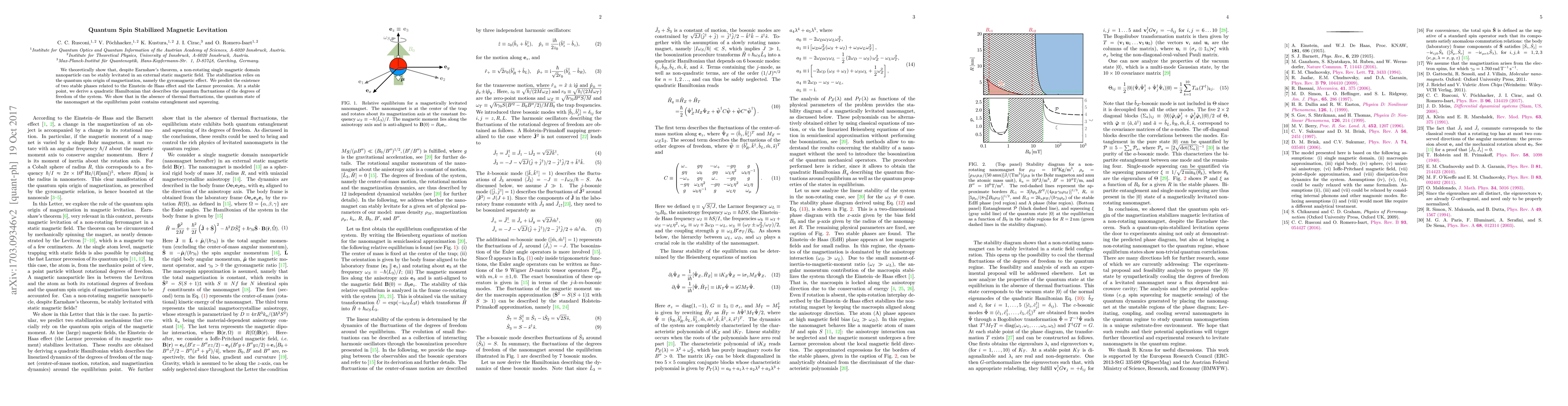 Researchers demonstrate that a single nanoparticle can be stably levitated in an external magnetic field due to quantum spin stabilization, contradicting Earnshaw's theorem, and exhibit entanglement and squeezing at equilibrium.