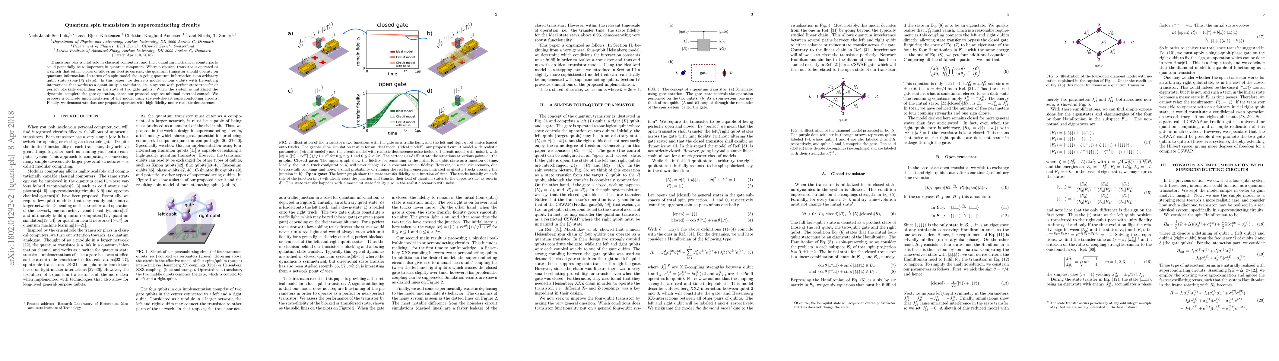 Transistors play a vital role in classical computers, and their quantum mechanical counterparts could potentially be as important in quantum computers. Where a classical transistor is operated as a switch that either blocks or allows an electric current, the quantum transistor should operate on quantum information. In terms of a spin model the in-going quantum information is an arbitrary qubit state (spin-1/2 state). In this paper, we derive a model of four qubits with Heisenberg interactions that works as a quantum spin transistor, i.e. a system with perfect state transfer or perfect blockade depending on the state of two gate qubits. When the system is initialized the dynamics complete the gate operation, hence our protocol requires minimal external control. We propose a concrete implementation of the model using state-of-the-art superconducting circuits. Finally, we demonstrate that our proposal operates with high-fidelity under realistic decoherence.