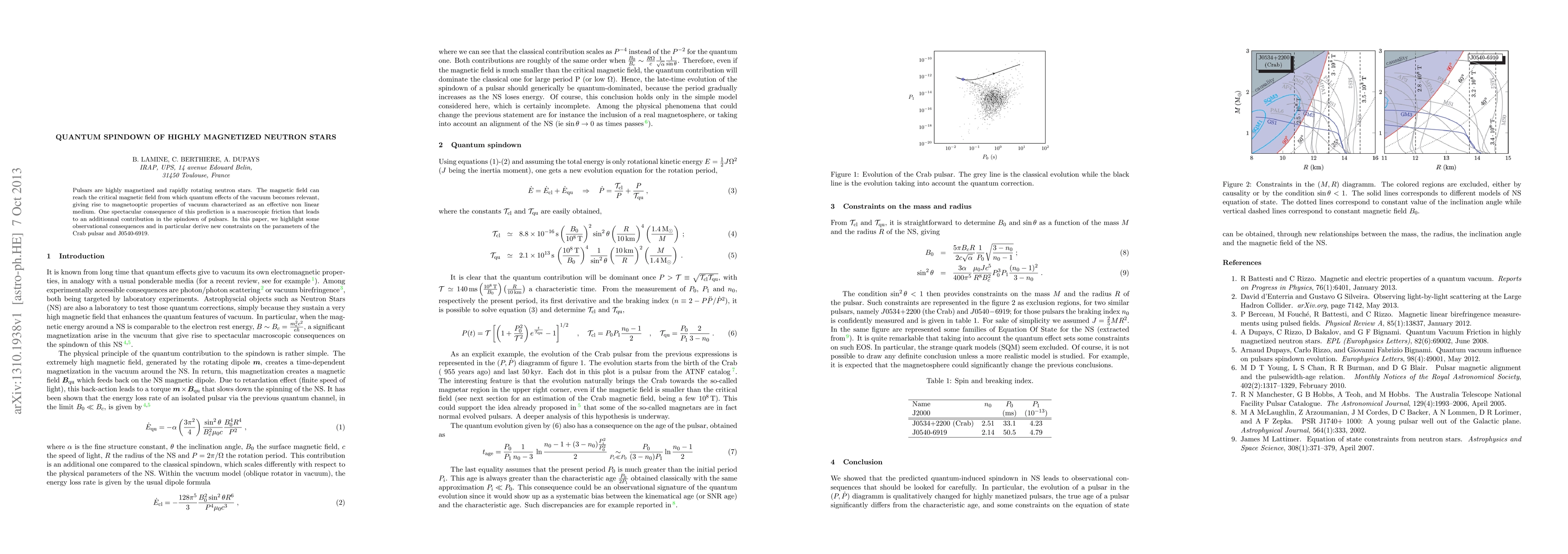This paper investigates the quantum spindown effects in highly magnetized neutron stars, proposing that quantum vacuum effects due to extreme magnetic fields can lead to macroscopic friction, contributing to the pulsar spindown. It derives new observational constraints for the Crab pulsar and J0540-6919 based on these quantum magnetooptic properties.