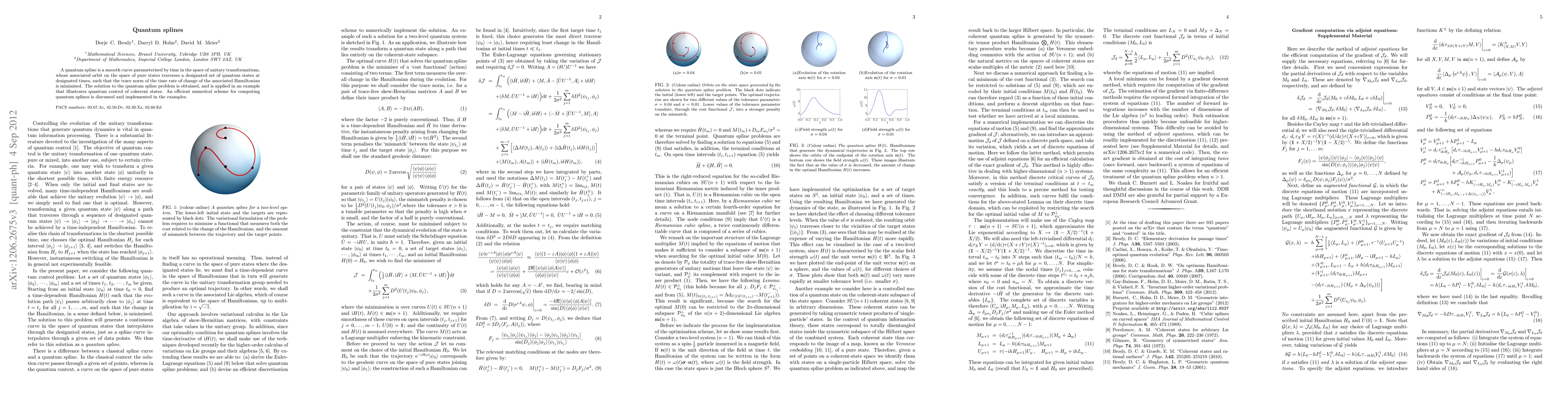 A quantum spline is a smooth curve parameterised by time in the space of unitary transformations, whose associated orbit on the space of pure states traverses a designated set of quantum states at designated times, such that the trace norm of the time rate of change of the associated Hamiltonian is minimised. The solution to the quantum spline problem is obtained, and is applied in an example that illustrates quantum control of coherent states. An efficient numerical scheme for computing quantum splines is discussed and implemented in the examples.