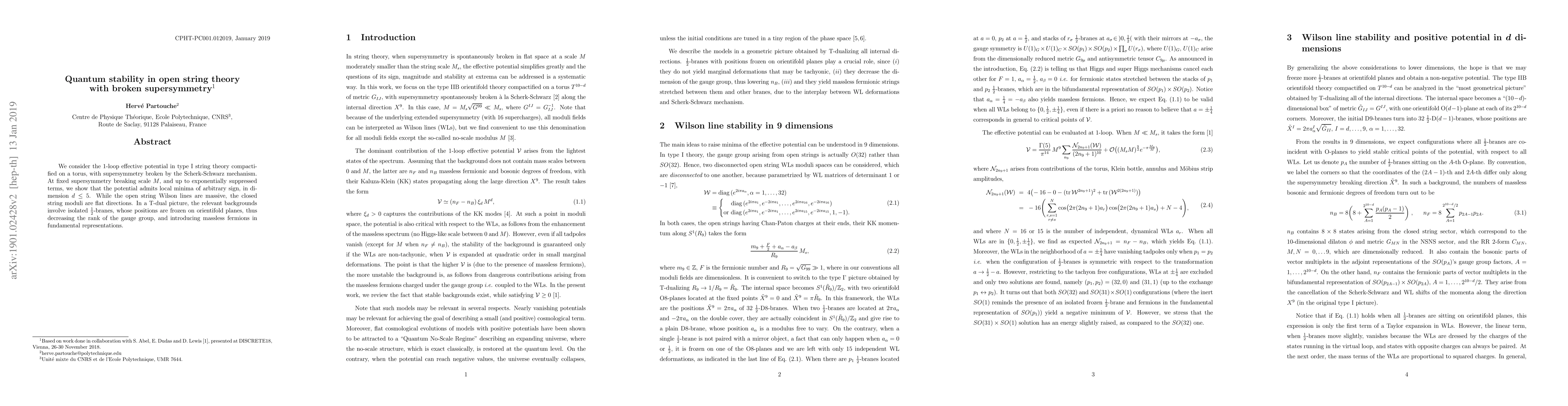 This paper investigates the 1-loop effective potential in type I string theory with broken supersymmetry, showing that it allows local minima of any sign in dimensions d<=5. The closed string moduli remain flat, while open string Wilson lines are massive, leading to a decrease in gauge group rank and introduction of massless fermions in fundamental representations in T-dual backgrounds.