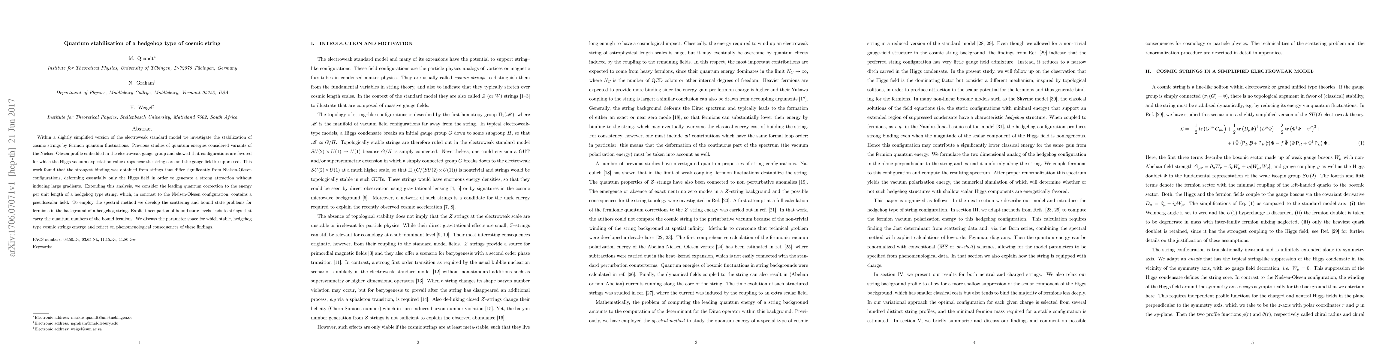Within a slightly simplified version of the electroweak standard model we investigate the stabilization of cosmic strings by fermion quantum fluctuations. Previous studies of quantum energies considered variants of the Nielsen-Olesen profile embedded in the electroweak gauge group and showed that configurations are favored for which the Higgs vacuum expectation value drops near the string core and the gauge field is suppressed. This work found that the strongest binding was obtained from strings that differ significantly from Nielsen-Olesen configurations, deforming essentially only the Higgs field in order to generate a strong attraction without inducing large gradients. Extending this analysis, we consider the leading quantum correction to the energy per unit length of a hedgehog type string, which, in contrast to the Nielsen-Olesen configuration, contains a pseudoscalar field. To employ the spectral method we develop the scattering and bound state problems for fermions in the background of a hedgehog string. Explicit occupation of bound state levels leads to strings that carry the quantum numbers of the bound fermions. We discuss the parameter space for which stable, hedgehog type cosmic strings emerge and reflect on phenomenological consequences of these findings.