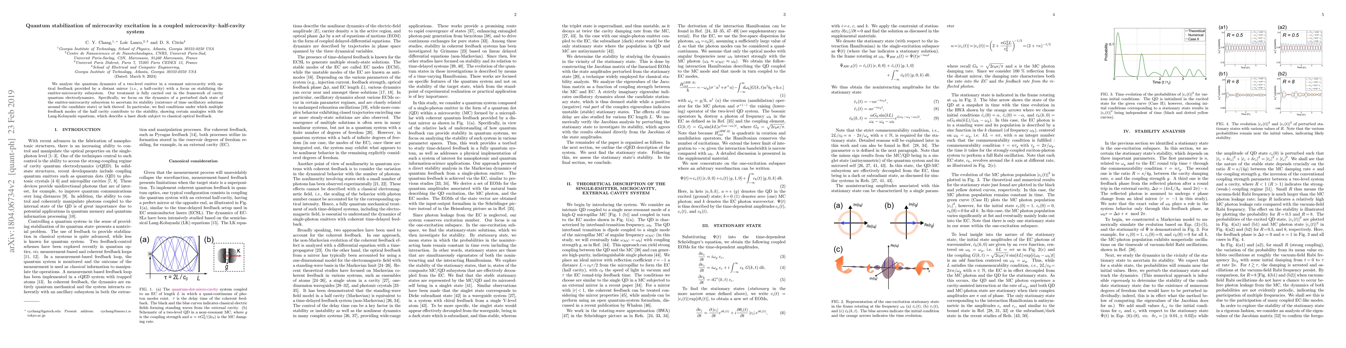 This paper investigates the quantum stabilization of a single-photon emitter in a coupled microcavity-half-cavity system using cavity quantum electrodynamics. The study reveals conditions under which multiple feedback modes enhance the stability of the perturbed dark state, drawing parallels to the Lang-Kobayashi equations for laser diodes with classical optical feedback.
