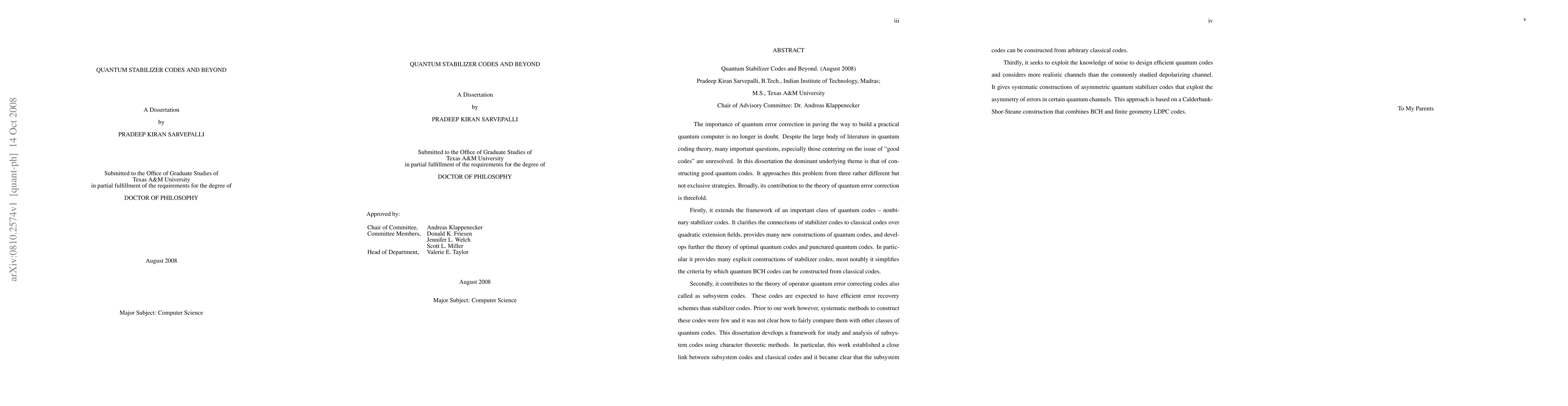 This paper extends the theory of quantum error-correcting codes by developing new constructions for nonbinary stabilizer codes and subsystem codes, establishing connections to classical codes, and proposing asymmetric quantum stabilizer codes for more realistic noise channels. It aims to advance practical quantum computing through improved error correction strategies.