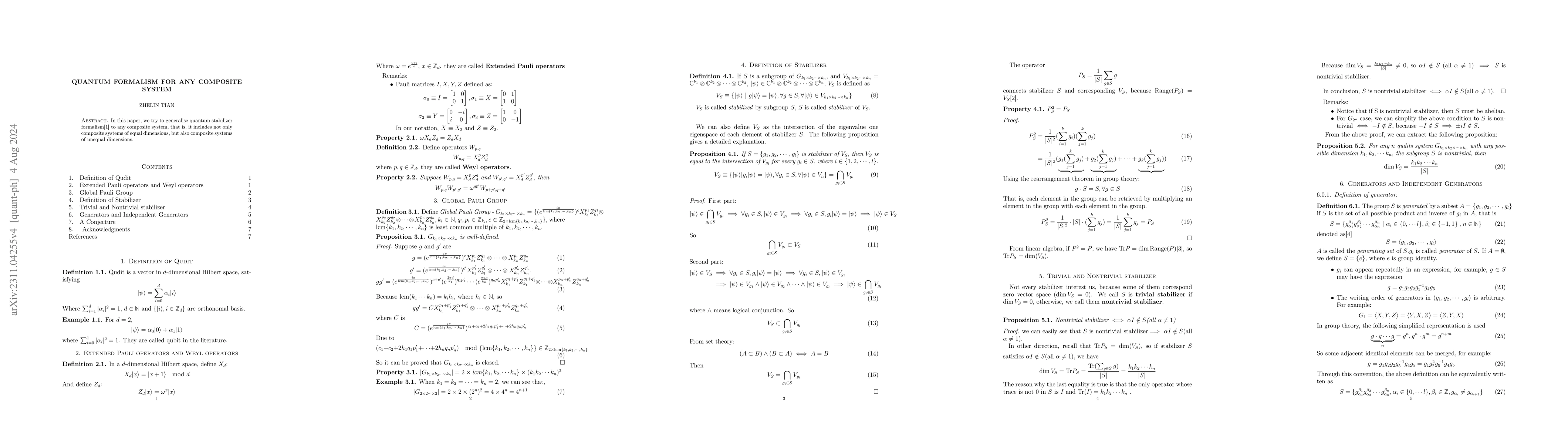 Summary: This research introduces the quantum stabilizer formalism, initially developed for quantum error correction, and extends its application to describe the evolution and measurement in quantum systems. It further extends the formalism to include composite systems like qubit-qutrit and qubit-ququart configurations, providing a new framework for arbitrary quantum composite systems.