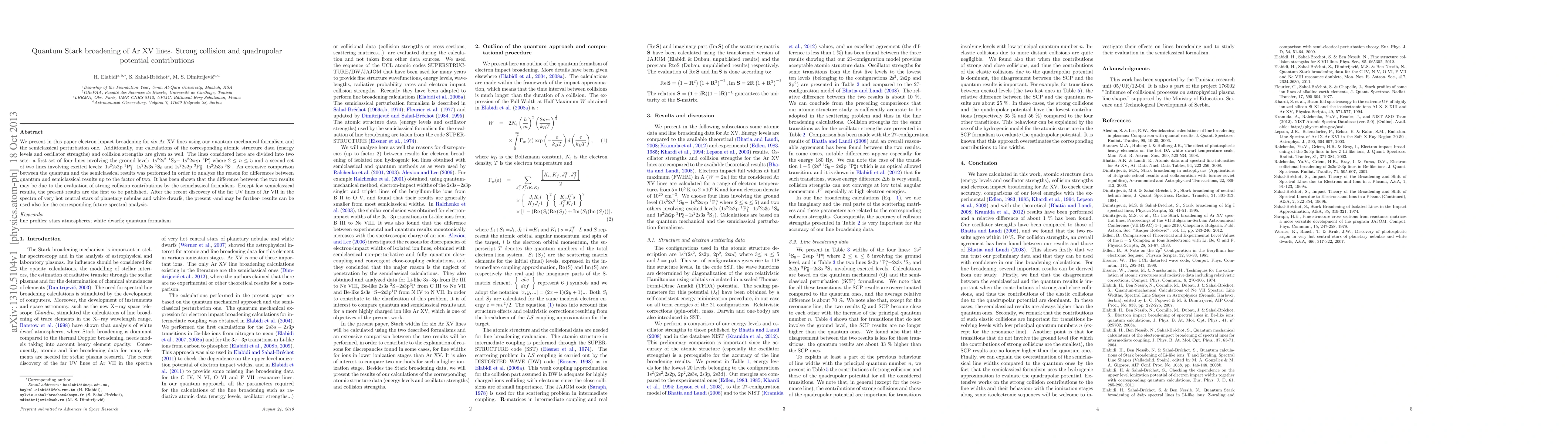 We present in this paper electron impact broadening for six Ar XV lines using our quantum mechanical formalism and the semiclassical perturbation one. Additionally, our calculations of the corresponding atomic structure data (energy levels and oscillator strengths) and collision strengths are given as well. The lines considered here are divided into two sets: a first set of four lines involving the ground level: 1s$^{2}2$s$^{2}$ $^{1}$S$_{0}-$1s$^{2}2$s$n$p $^{1}$P$^{\rm o}_{1}$ where $2\leq n \leq5$ and a second set of two lines involving excited levels: 1s$^{2}2$s2p $^{1}$P$^{\rm o}_{1}-$1s$^{2}2$s3s $^{1}$S$_{0}$ and 1s$^{2}2$s2p $^{3}$P$^{\rm o}_{0}-$1s$^{2}2$s3s $^{3}$S$_{1}$. An extensive comparison between the quantum and the semiclassical results was performed in order to analyze the reason for differences between quantum and semiclassical results up to the factor of two. It has been shown that the difference between the two results may be due to the evaluation of strong collision contributions by the semiclassical formalism. Except few semiclassical results, the present results are the first to be published. After the recent discovery of the far UV lines of Ar VII in the spectra of very hot central stars of planetary nebulae and white dwarfs, the present -and may be further- results can be used also for the corresponding future spectral analysis.