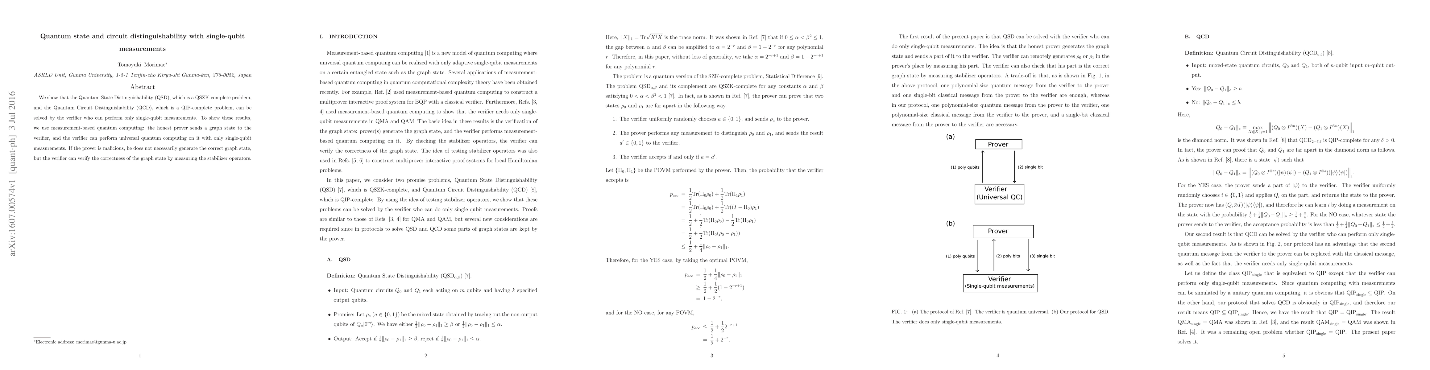 This paper demonstrates that Quantum State Distinguishability and Quantum Circuit Distinguishability can be verified using only single-qubit measurements. The verifier employs measurement-based quantum computing on a graph state sent by the prover, verifying the state's correctness through stabilizer measurements.