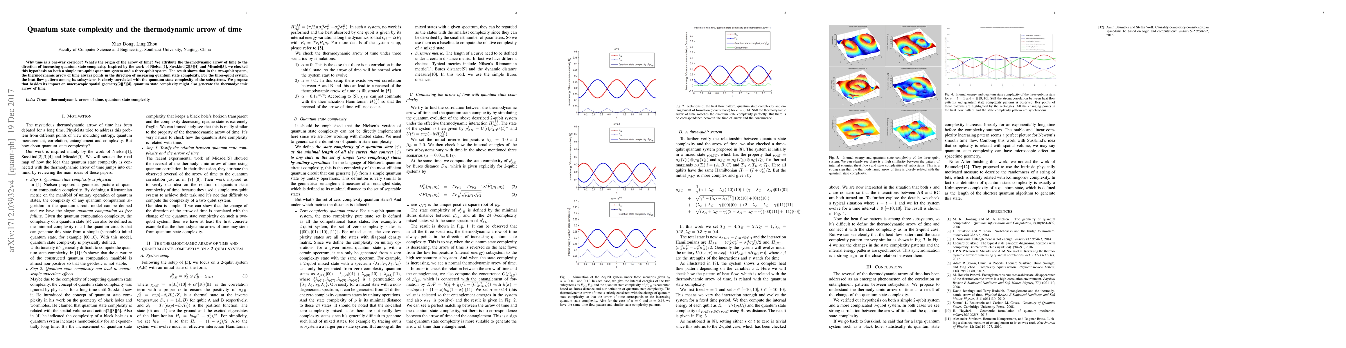 This paper investigates the thermodynamic arrow of time, proposing that it correlates with the direction of increasing quantum state complexity. Experiments on two and three qubit quantum systems support this hypothesis, especially in the latter where heat flow patterns among subsystems are linked to quantum state complexity, suggesting that this complexity may also generate the thermodynamic arrow of time.