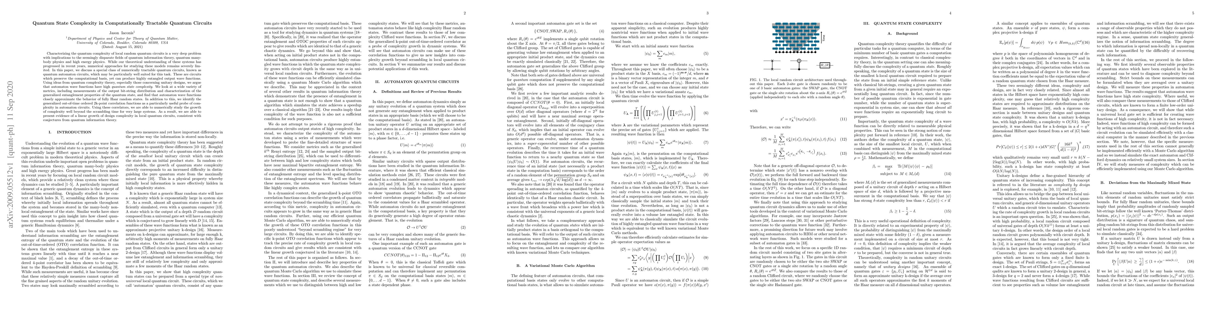 This paper explores quantum state complexity in computationally tractable quantum automaton circuits, which preserve the computational basis but produce highly entangled outputs. The study uses various metrics to show that these circuits approximate the behavior of fully random quantum states, revealing a linear growth of complexity consistent with quantum information theory conjectures.