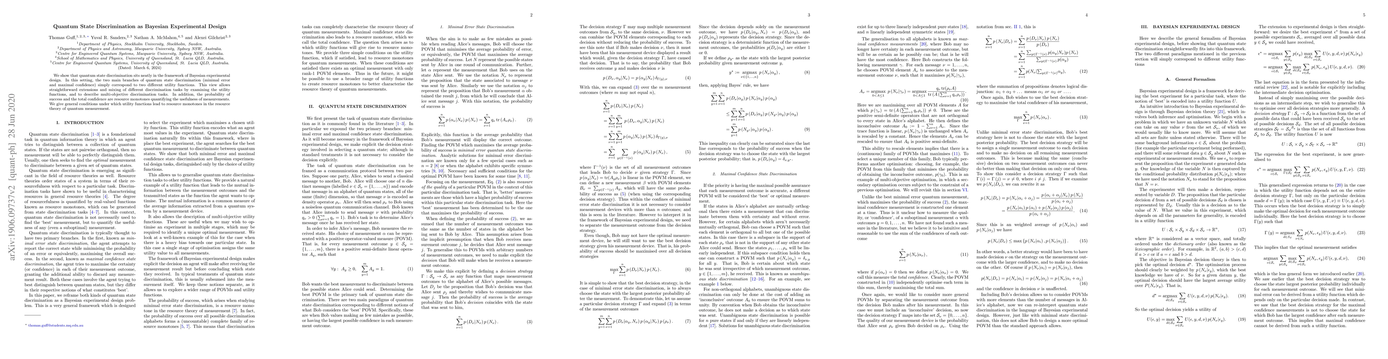 This paper frames quantum state discrimination within Bayesian experimental design, showing that minimal error and maximal confidence correspond to different utility functions. It also discusses how this framework facilitates the extension and mixing of various discrimination tasks and introduces resource monotones for quantifying measurement usefulness.