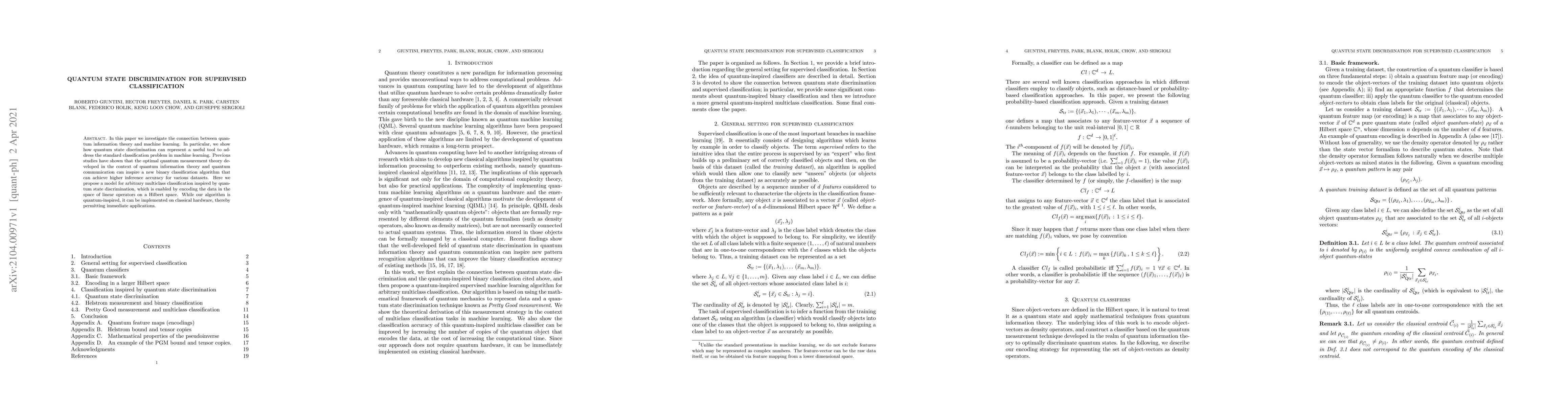 This paper explores the integration of quantum state discrimination into machine learning for multiclass classification, proposing a quantum-inspired model that leverages linear operators on a Hilbert space. Despite its quantum foundation, the algorithm can be executed on classical hardware, offering practical applications in supervised classification.