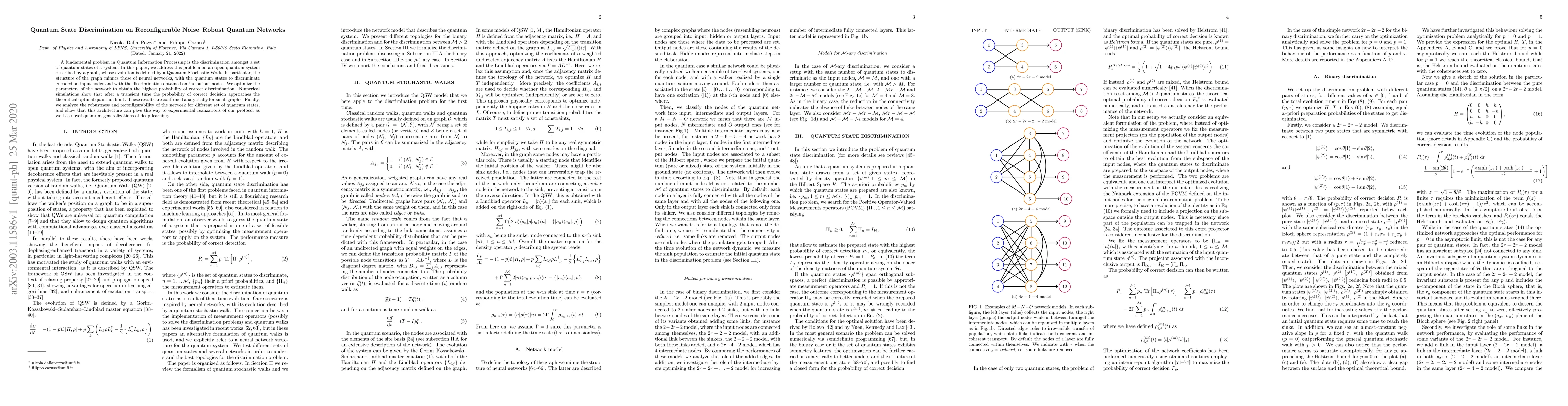 This paper proposes a method for quantum state discrimination using a reconfigurable noise-robust quantum network modeled by a Quantum Stochastic Walk on a graph. The network's parameters are optimized to achieve the highest probability of correct discrimination, approaching the theoretical optimal quantum limit, and demonstrating robustness and reconfigurability for different quantum states.