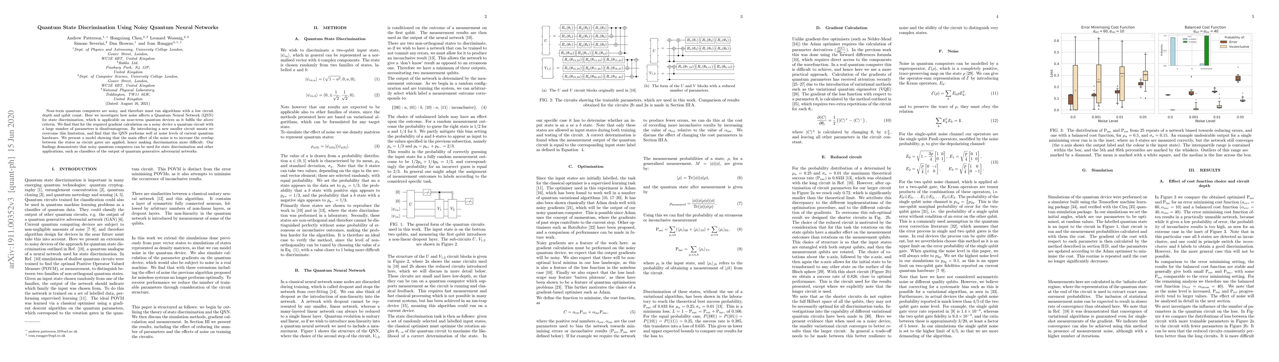 This paper explores how noisy quantum neural networks (QNNs) can effectively perform state discrimination on near-term quantum computers. It demonstrates that smaller circuit ansatzes mitigate the adverse effects of noise, enabling successful training and performance even at current quantum hardware noise levels.